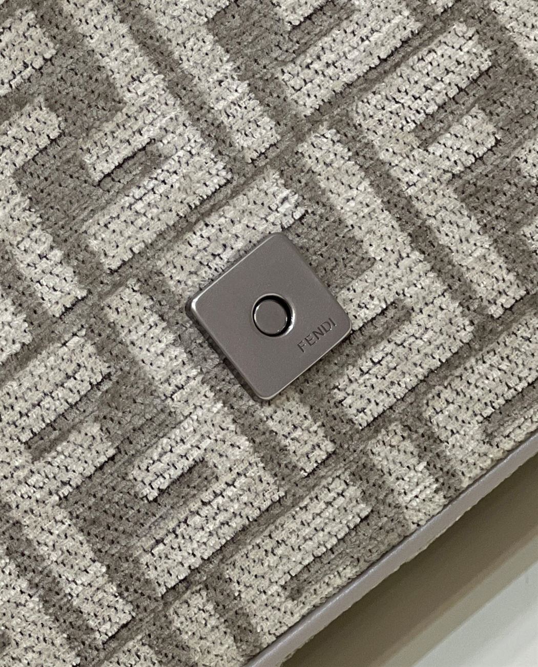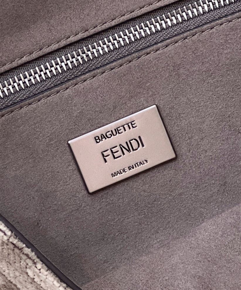Baguette Chain Midi bag by Fendi crafted in chenille with all-over tapestry FF motif. Suedette lining and one inner zipped flat pocket.