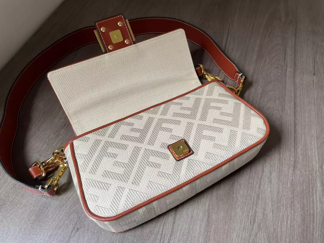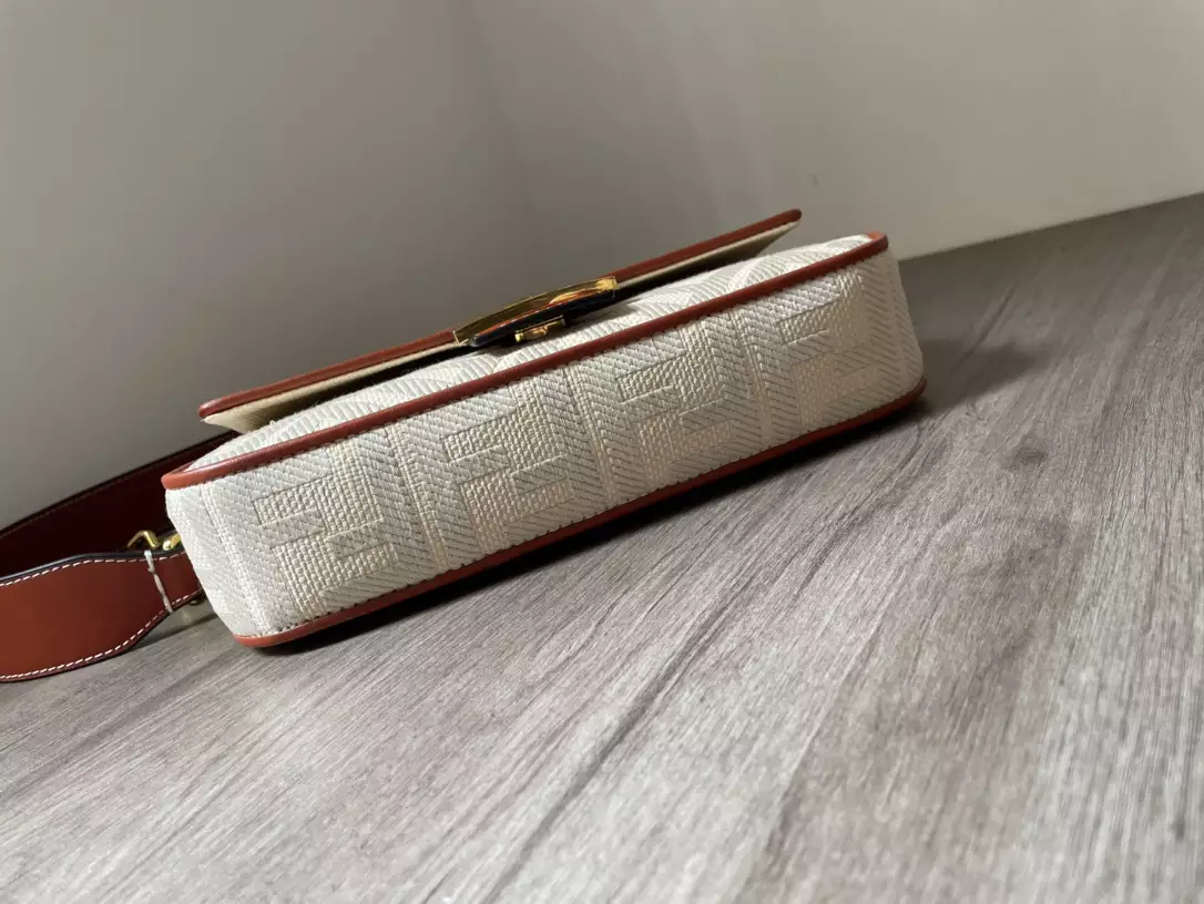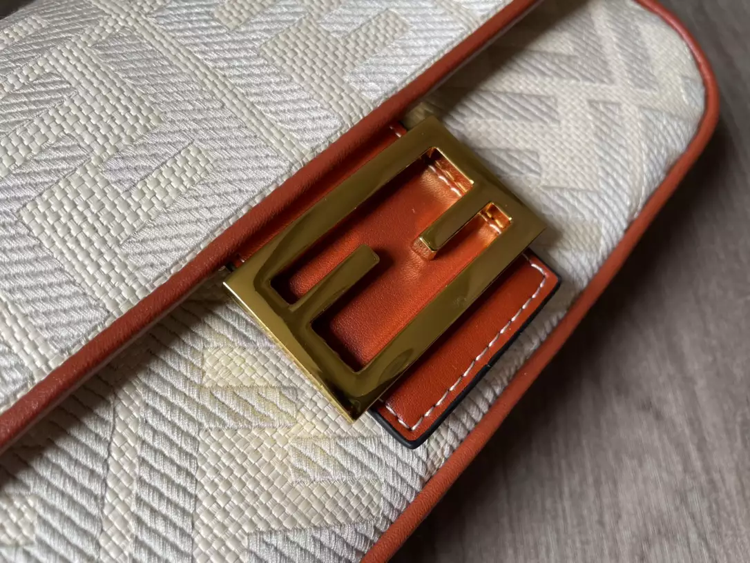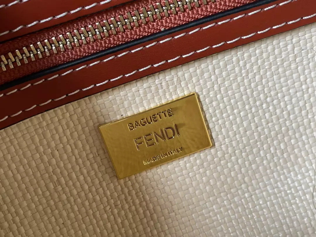 #Fendi #BaguetteBag #MediumSize #NaturalStraw #RaisedEmbroideredFFMotif #BrownLeatherTrim #FFClasp #MagneticClasp #VintageGoldFinishHardware #FashionAccessory