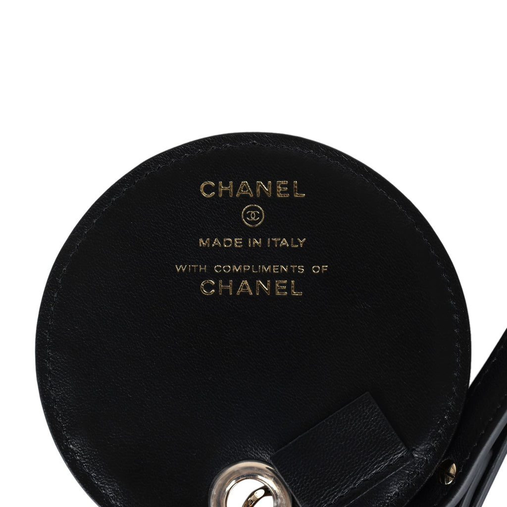 Chanel Round Luggage Tag Black Lambskin Light Gold Hardware Shop for an authentic Chanel Round Luggage Tag in black lambskin leather with light gold hardware in new and never worn condition at Madison Avenue Couture.