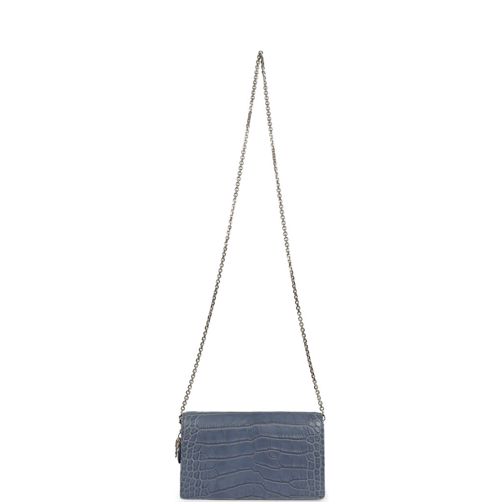 This Christian Dior Convertible Clutch Bag is in blue alligator leather with light gold tone hardware, featuring magnetic snap closure, a detachable long light gold tone chain link shoulder/crossbody strap, and a clip on light gold tone DIOR letters charm.The interior is lined in blue lambskin leather with a slip pocket on the rear wall and a removable eight slot card holder insert.Origin: ItalyCondition: Never wornAccompanied by: Dior dustbag, detachable chainlink strap, long card holder pouchMeasurements: 8.5” width x 5″ height x 1.5″ depth; 22″ shoulder strap drop