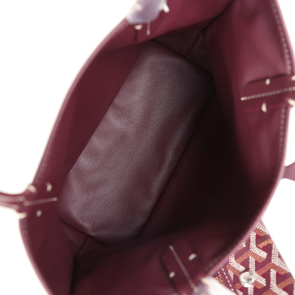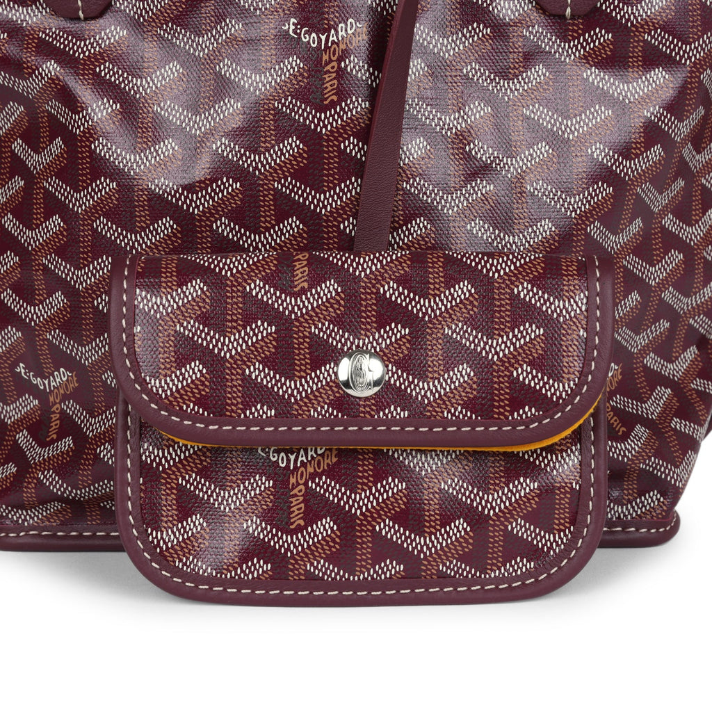 This Anjou mini reversible tote is in burgundy goyardine canvas and leather with palladium hardware and features contrast stitching, burgundy leather handles and trim, and a detachable yellow pouch.The interior is in burgundy chevroches calfskin and is reversible.Origin: FranceCondition: New and never worn (plastic on handles)Accompanied by: Goyard dustbag, felt, removable pouch, retail tag, carebookMeasurements: 8” x 8″ x 4″; 7″ shoulder strap