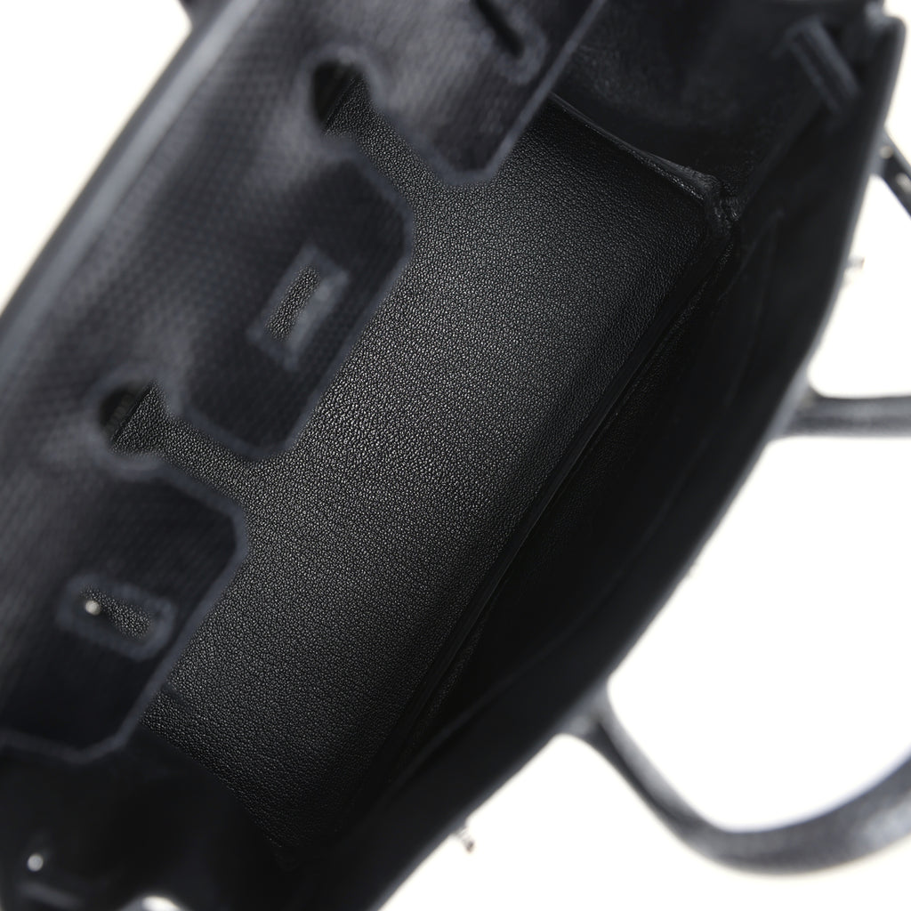 This Birkin is in Black Shiny Varanus Niloticus lizard leather with palladium hardware and has tonal stitching, front flap, two straps with center toggle closure, clochette with lock and two keys, and double rolled handles.The interior is lined with Black chevre and has one zip pocket with an Hermes engraved zipper pull and an open pocket on the opposite side.Collection: B (2023)Origin: FranceCondition: New and never worn (plastic on hardware)Accompanied by: Hermes box, Hermes dustbag, clochette, lock, two keys, clochette dustbag, ribbon, carebook, CITES Measurements: 10″ width x 7.5″ height x 4.75″ depth; 2.75″ handle drop