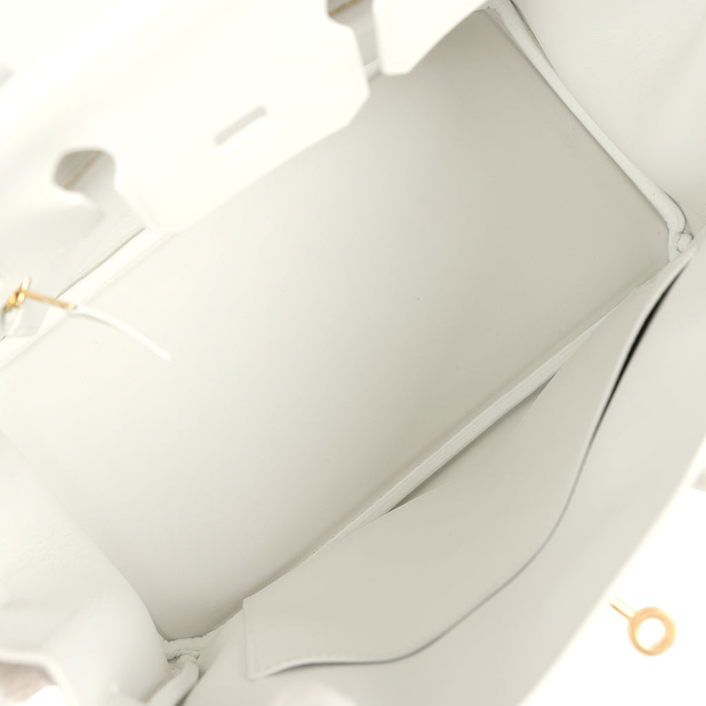 This Birkin is in New White swift leather with gold hardware and has tonal stitching, two straps with front toggle closure, clochette with lock and two keys and double rolled handles.The interior is lined with New White swift leather and has one zip pocket with an Hermes engraved zipper pull and an open pocket on the opposite side.Collection: W (2024)Origin: FranceCondition: New and never worn (Plastic on hardware)Accompanied by: Hermes box, Hermes dustbag, felt, clochette, clochette dustbag, lock, two keys, carebookMeasurements: 10″ width x 7.5″ height x 4.75″ depth; 2.75″ handle drop