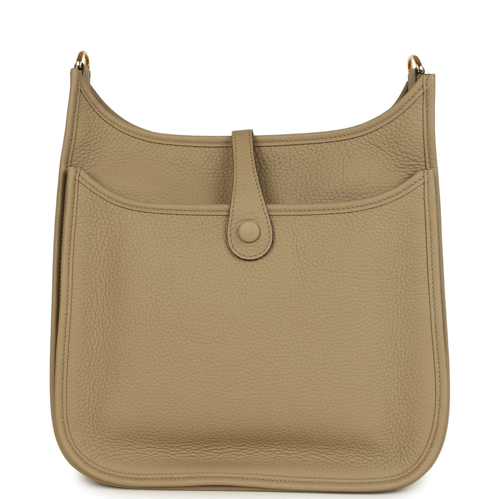 Hermes Evelyne III PM Beige Marfa Clemence Gold Hardware Shop for an authentic Hermes Evelyne III PM in Beige Marfa Clemence leather with gold hardware in new and never worn condition at Madison Avenue Couture.