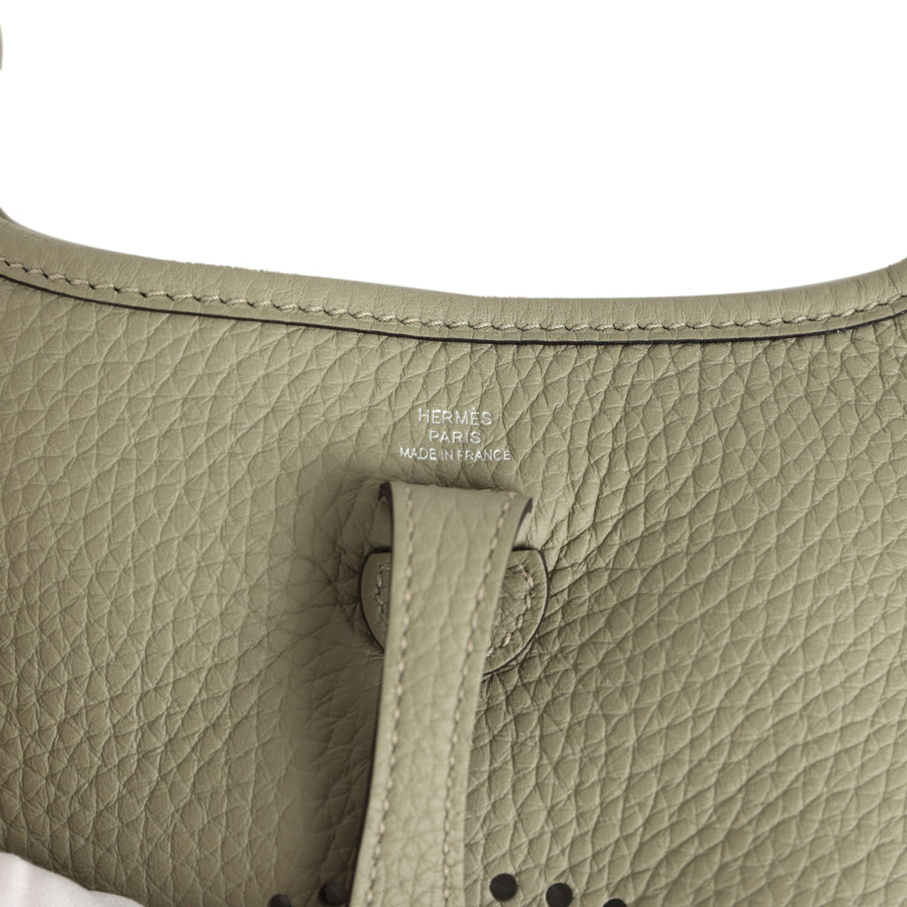 Hermes Evelyne TPM Sauge Clemence Palladium Hardware Shop for an authentic Hermes Evelyne TPM in Sauge clemence leather with palladium hardware in new and never worn condition at Madison Avenue Couture.