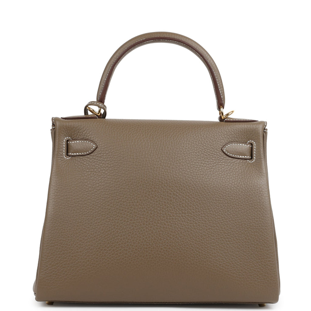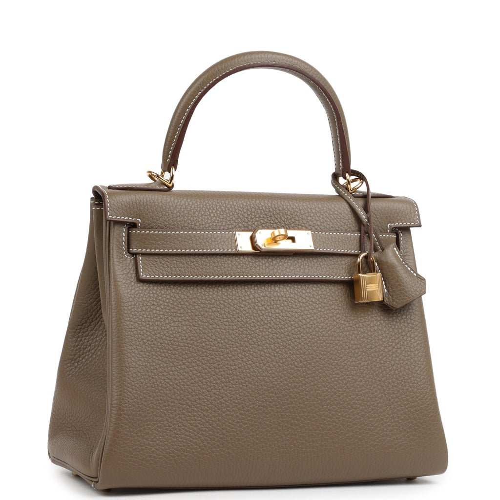 Hermes Kelly Retourne 28 Etoupe Clemence Gold Hardware Shop for an authentic Hermes Kelly Retourne 28 in Etoupe clemence leather with gold hardware in new and never worn condition at Madison Avenue Couture.