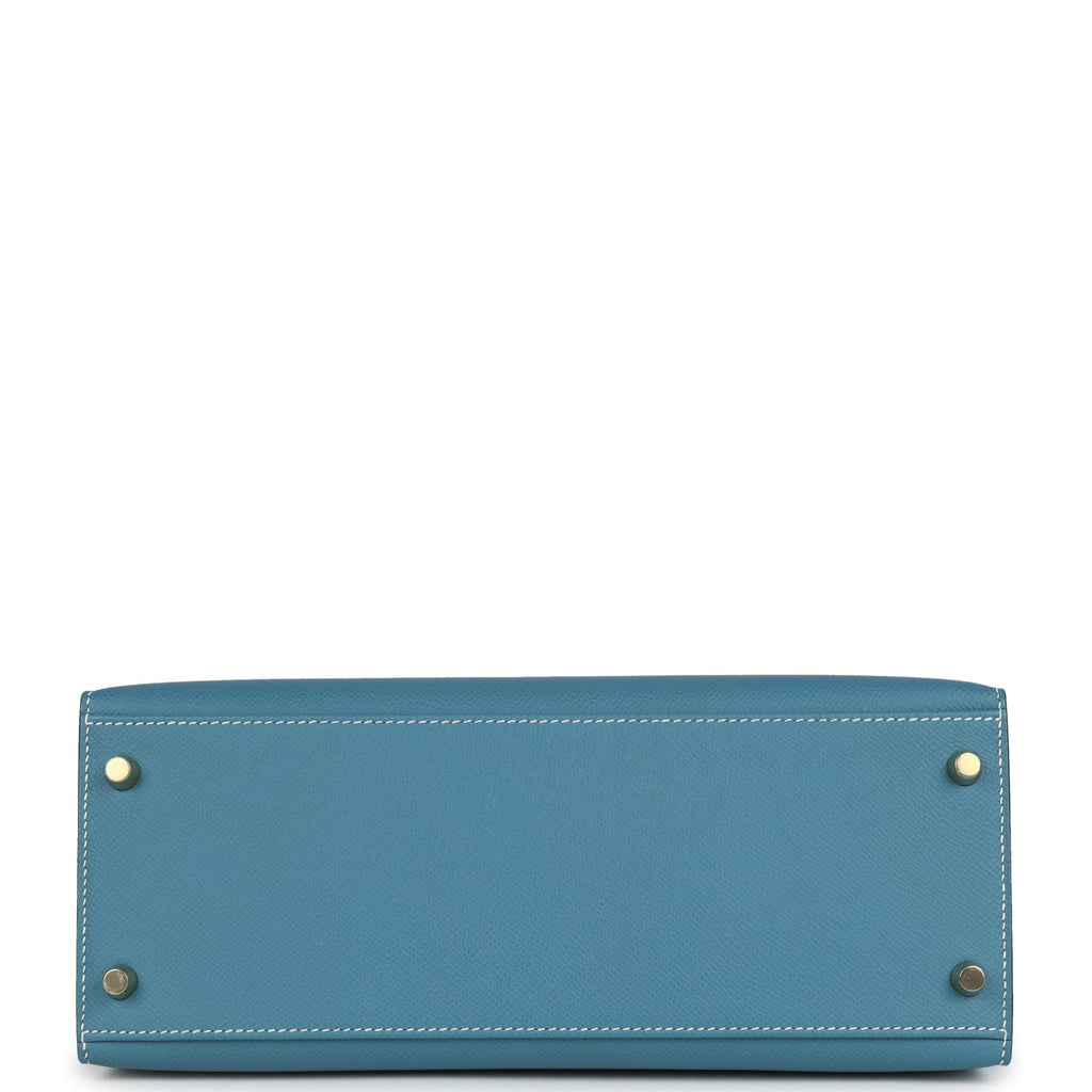 This Kelly, in the Sellier style, is in Blue Jean epsom leather with gold hardware, has contrast stitching, front flap, two straps with center toggle closure, clochette with lock and two keys, single rolled handle and removable shoulder strap.The interior is lined with Blue Jean chevre leather and has one zip pocket with an Hermes engraved pull and two open pockets on the opposite side.Collection: W (2024) Origin: FranceCondition: New and never worn (plastic on hardware)Accompanied by: Hermes box, Hermes dustbag, clochette, lock, two keys, shoulder strap, clochette dustbag, shoulder strap dustbag, felt, rainhat, carebookMeasurements: 11.25″ width x 8.25″ height x 4.5″ depth; 3.5″ handle drop (16.5″ shoulder strap drop)