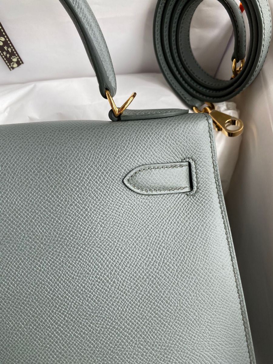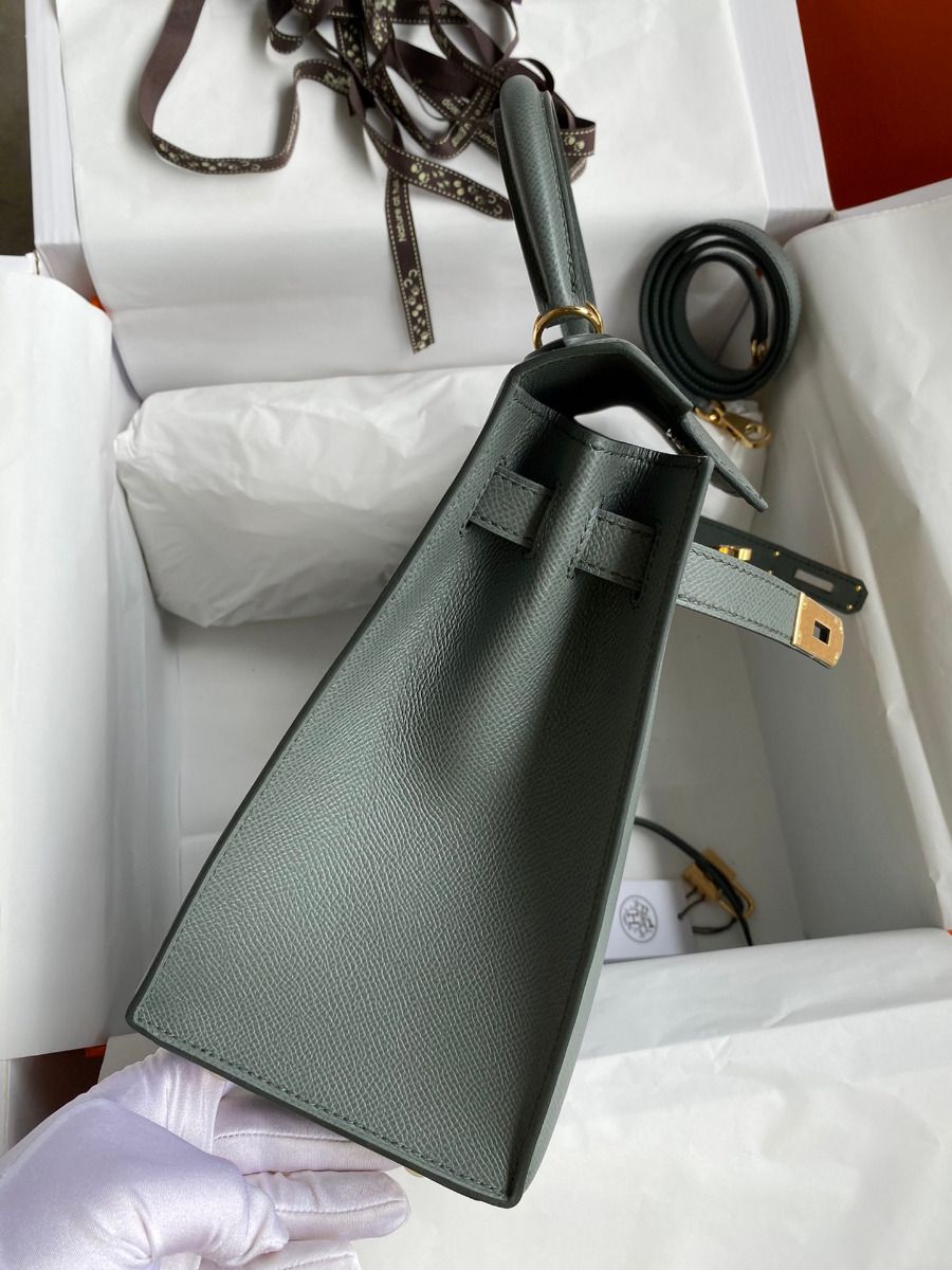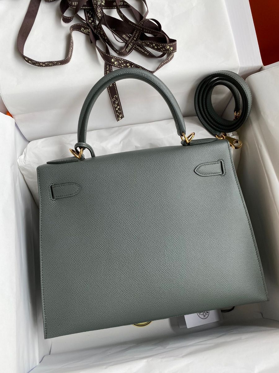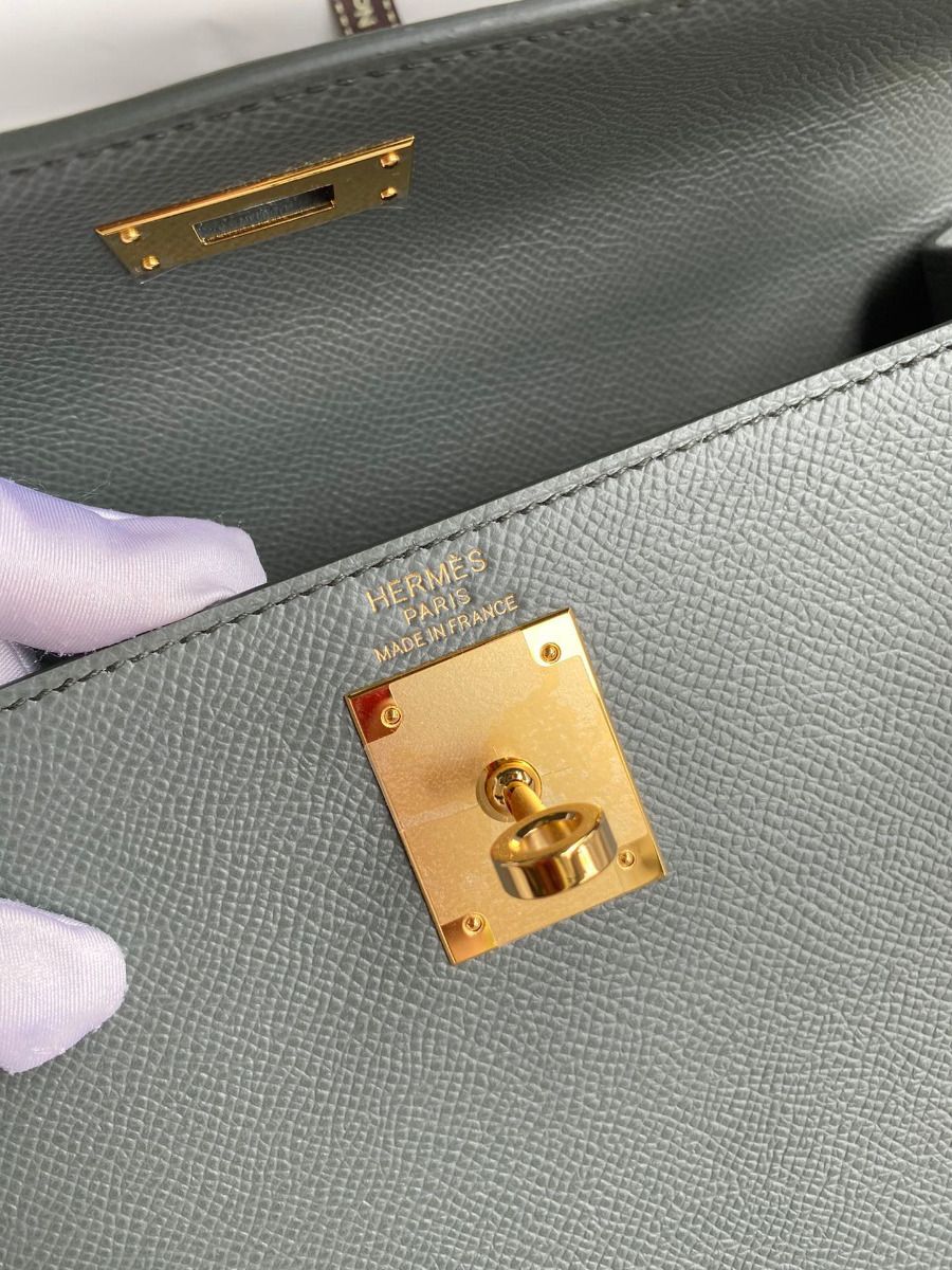 This Hermès Kelly 28 cm bag is handcrafted by skilled artisans using vert amande Epsom calfskin. Created in Sellier style, which features external stitching with sharp, clean structural lines.