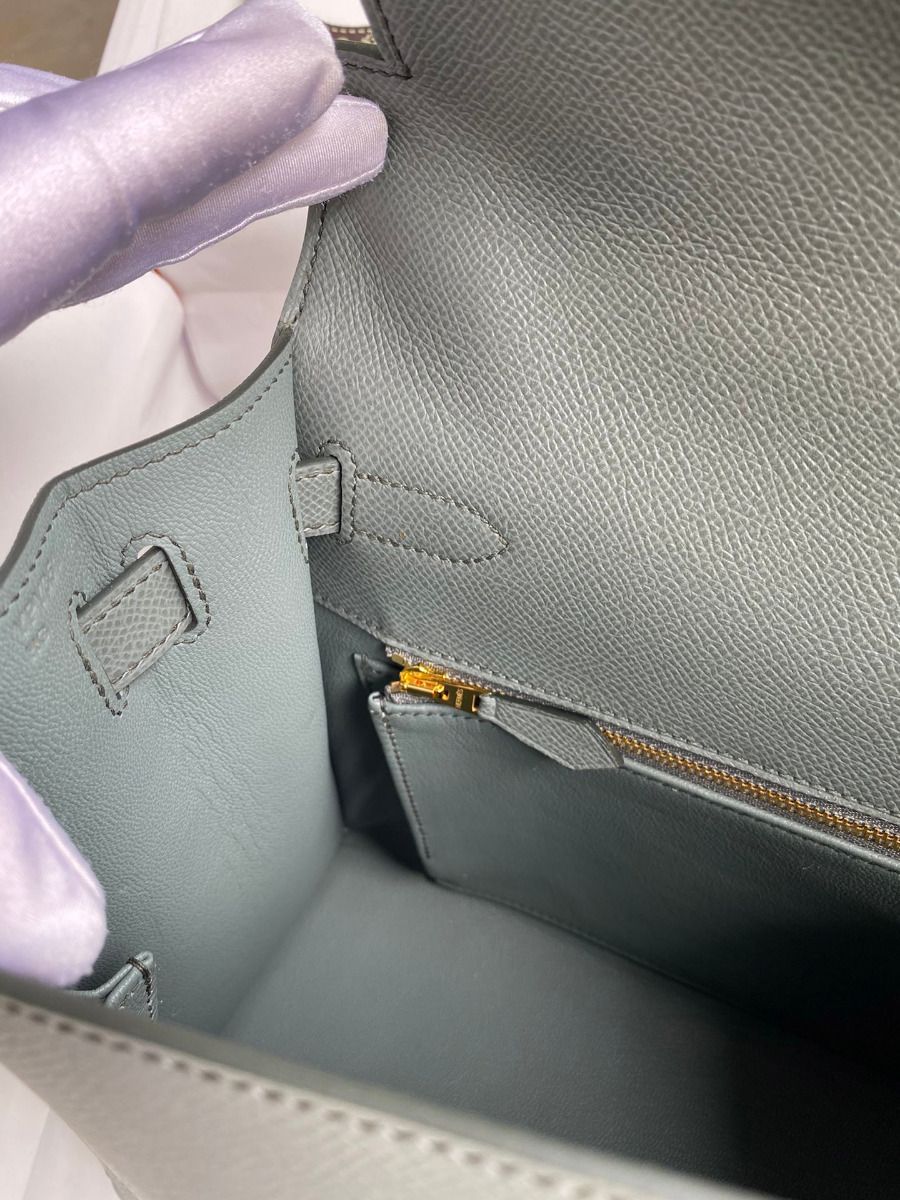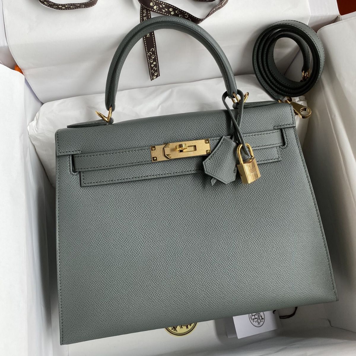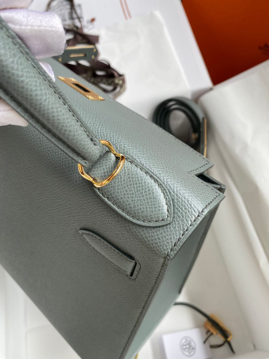 This Hermès Kelly 28 cm bag is handcrafted by skilled artisans using vert amande Epsom calfskin. Created in Sellier style, which features external stitching with sharp, clean structural lines.