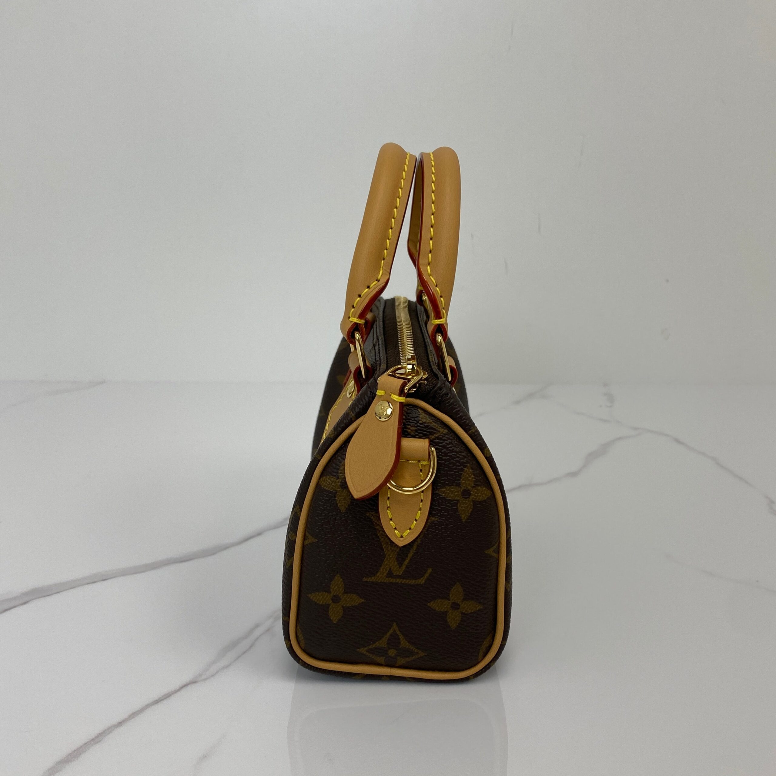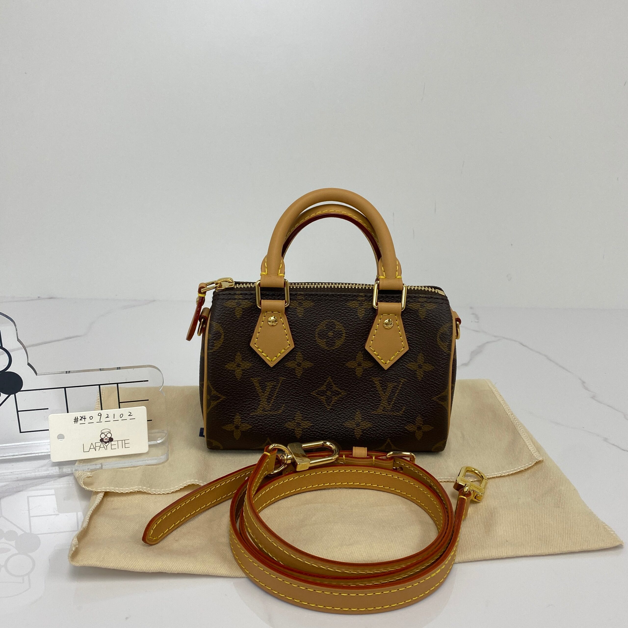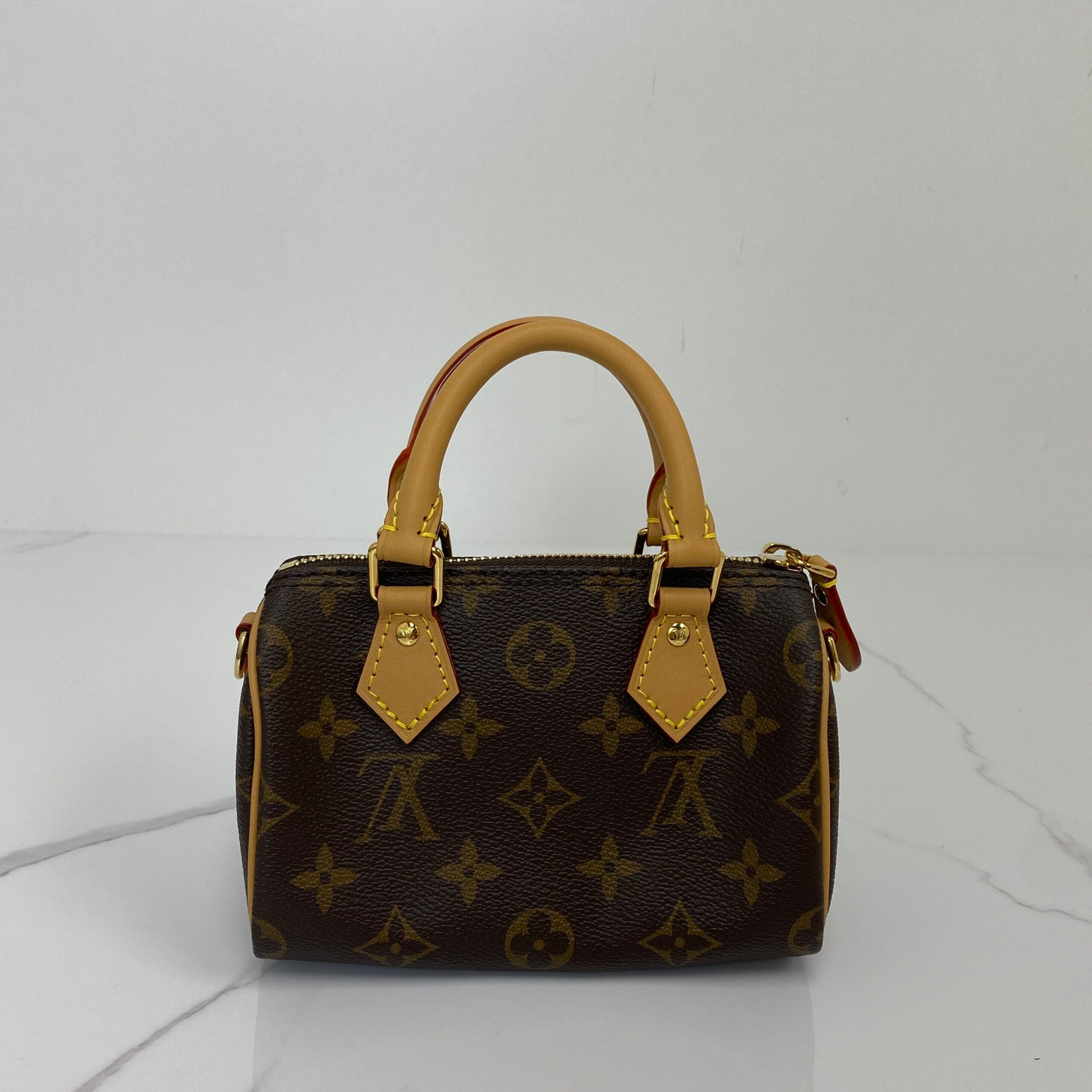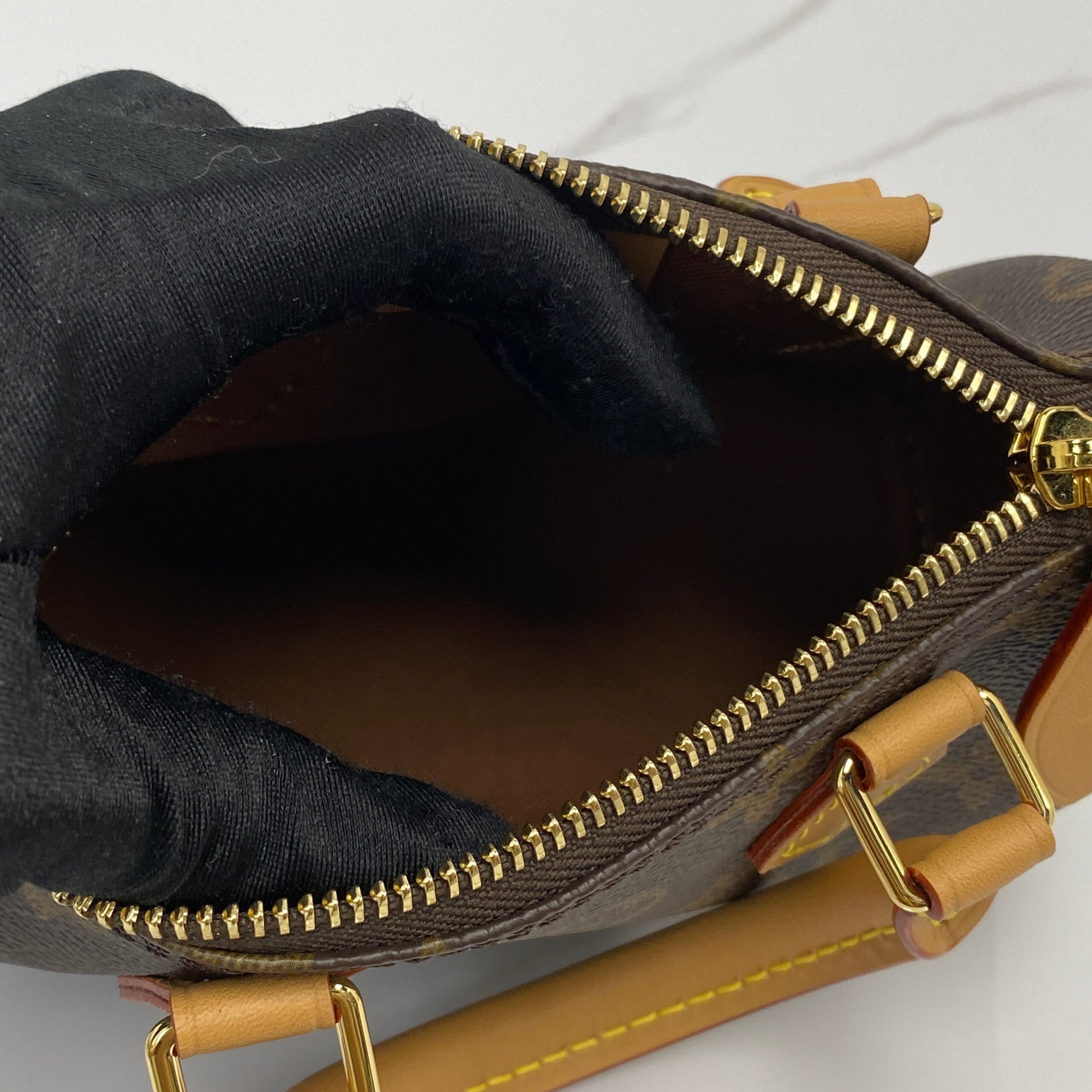 A timeless icon in a compact form, the Louis Vuitton Nano Speedy is a testament to the brand’s legacy of elegance and craftsmanship. Crafted from durable coated Monogram Canvas, this mini version of the beloved Speedy captures the spirit of adventure and sophistication. It’s a bag that’s as charming as it is functional, ideal for those who appreciate the art of understated luxury.