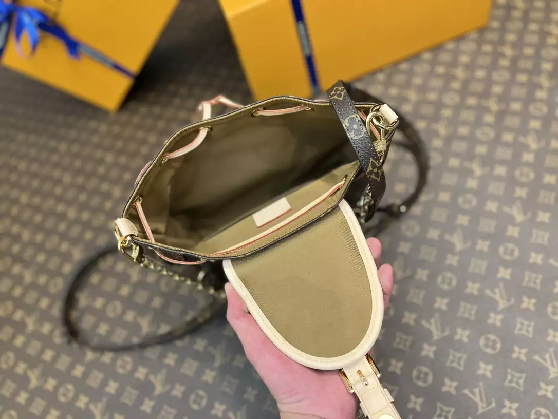 Crafted from Monogram Canvas material with leather trim, it features one main compartment and two zippered sub-compartments.
