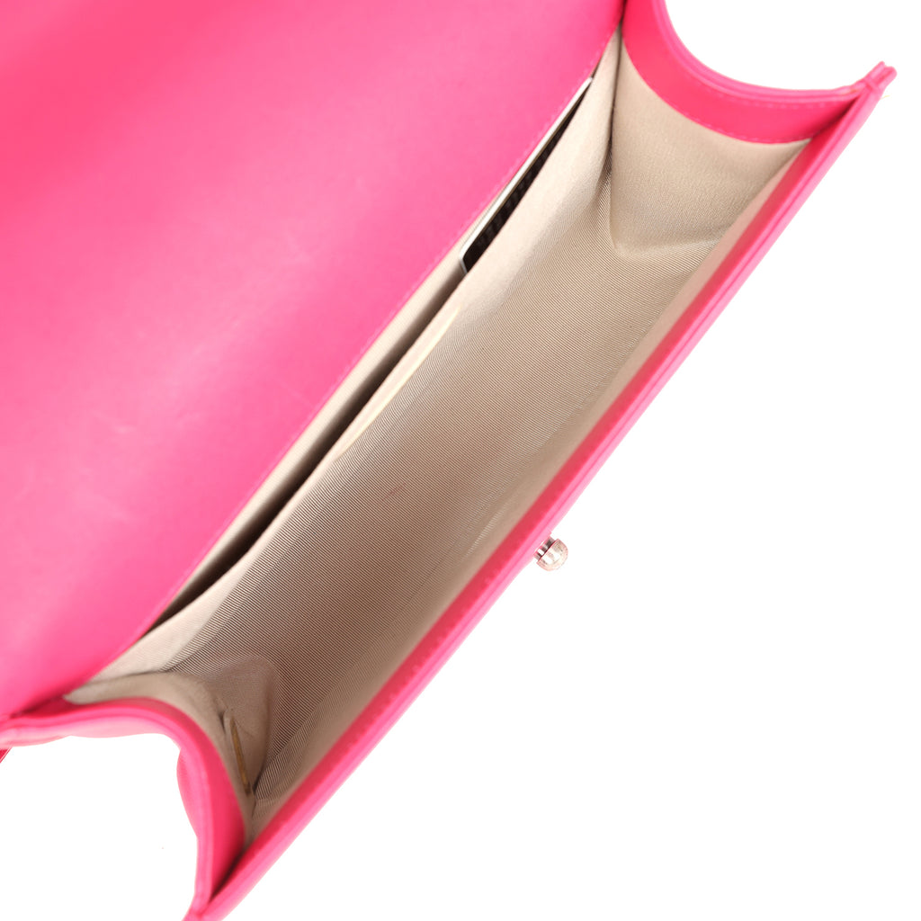 This Chanel Old Medium Boy Bag is in pink lambskin leather with aged ruthenium hardware, featuring tonal stitching, front flap with Le Boy CC push closure, smooth leather trim, and aged ruthenium chainlink and Pink leather shoulder strap.The interior is lined in beige grossgrain fabric and has one slit pocket on rear wall.Collection: 19-Series (2014)Origin: FranceCondition: Pre-owned; Excellent – This bag is relaxed in shape structure. The exterior leather has noticeable wear with rubbing to the bottom corners and there is some creasing, a few press markings on the front, and overall wear to the leather. There are no signs of wear to the hardware. The interior leather has light scuff markings on the flap and the interior canvas a a few tiny stains to the interior. The interior canvas has a faint smell.Accompanied by: Chanel box, Chanel dustbag, carebook, COA cardMeasurements: 9.8″ width x 5.9″ height x 3.5″ depth; 22″ strap drop (12″ doubled)