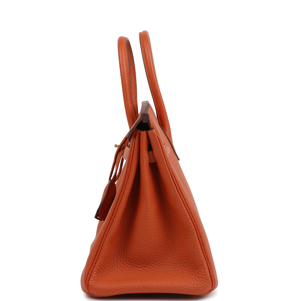 This Birkin is in Orange togo leather with gold hardware and has tonal stitching, front flap, two straps with center toggle closure, clochette with lock and two keys, and double rolled handles.The interior is lined with Orange chevre and has a zip pocket with an Hermes engraved zipper pull and an open pocket on the opposite side.Collection: T (2015)Origin: FranceCondition: Pre-owned; Mint – This bag retains its shape structure. There is plastic on all the hardware, but it is not original plastic. Beneath the plastic, there are some light scratches to the turnlock. The exterior leather is clean with the exception of two tiny chips to the back handle left side and some minor splitting to the front flap opening where the turnlock sits. The interior leather is clean with no signs of wear.Accompanied by: Hermes box, Hermes dustbag, felt, clochette, lock, two keys, clochette dustbag, carebook, rainhatMeasurements: 10″ width x 7.5″ height x 4.75″ depth; 2.75″ handle drop