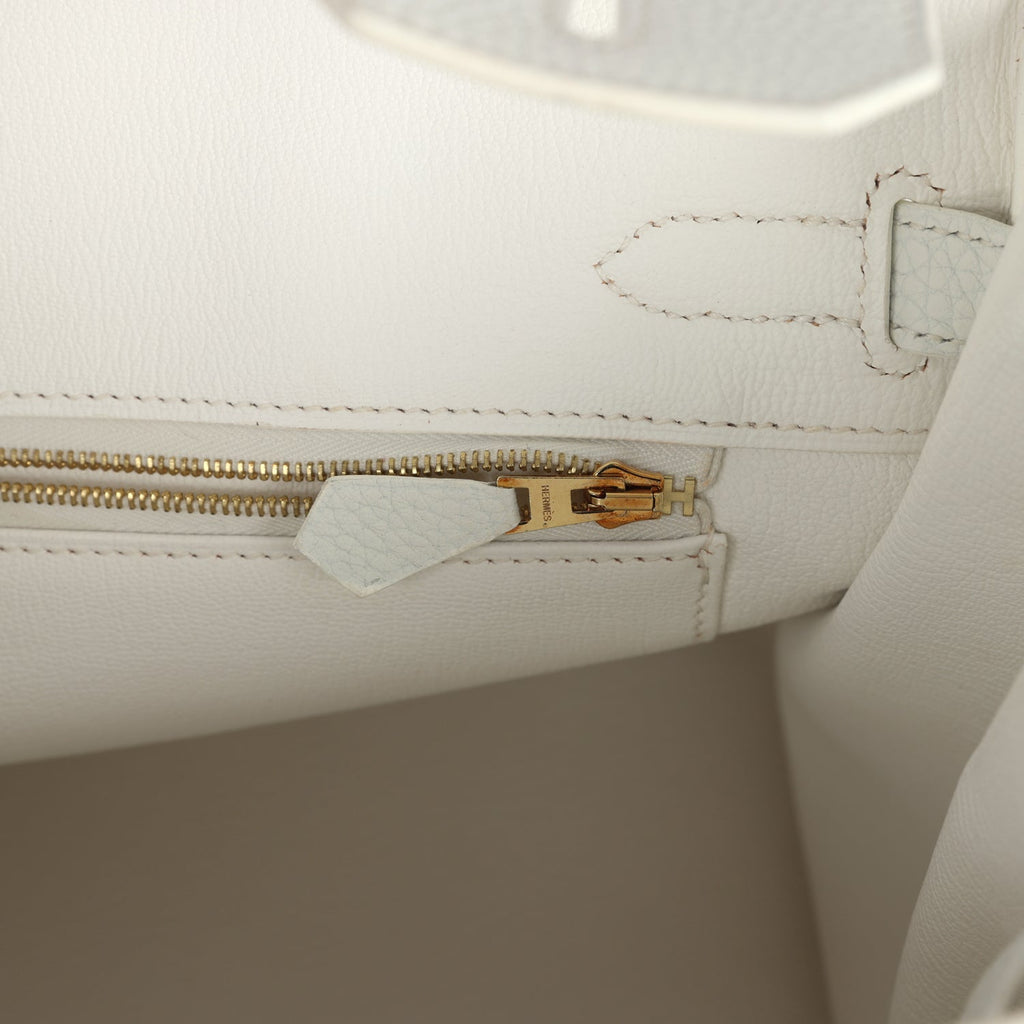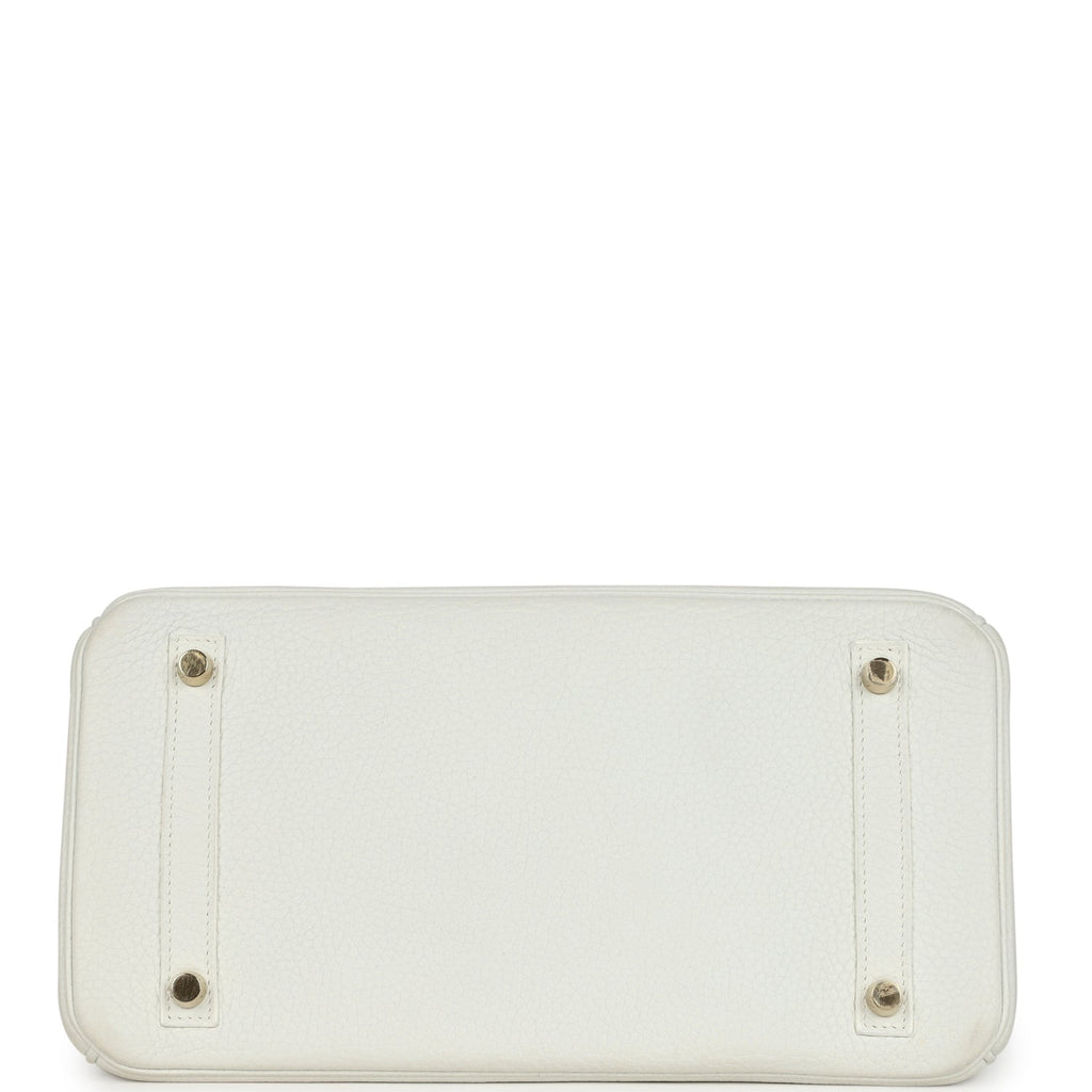 This Birkin is in White clemence leather with Gold hardware and has tonal stitching, two straps with front toggle closure, clochette with lock and two keys and double rolled handles.The interior is lined with White chevre leather and has one zip pocket with an Hermes engraved zipper pull and an open pocket on the opposite side.Collection: X (2016)Origin: FranceCondition: Pre-owned; Excellent – This bag is slightly slouched in the front. There is partial plastic on the hardware. There are light but visible scratches to the hardware and the exterior rivets are discolored. The exterior leather has noticeable wear to the bag with minor darkening to the edging of the bag, wear to the bottom corners, discoloration to the top handles, a faint spot on the front flap, and discoloration to the edge paint/resin on the front flap, one of the pull straps, and the top handles. The pull straps have some minor cracking to the edge paint/resin. The interior leather has some discoloration to the stitching, faint spots on the front interior wall, and the interior zipper on back wall has noticeable discoloration.Accompanied by: MAC dustbag, clochette, lock, two keysMeasurements: 11.75″ width x 9.5″ height x 6″ depth; 4″ handle drop