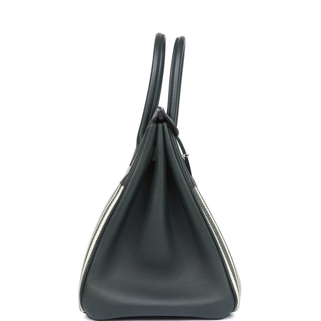 Pre-owned Hermes Birkin 35 Toile Riga and Vert Anglais Swift Palladium Hardware Shop for an authentic pre-owned Hermes Birkin 35 is in Toile Riga and Vert Anglais swift leather with palladium hardware in excellent condition at Madison Avenue Couture.