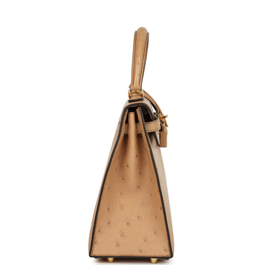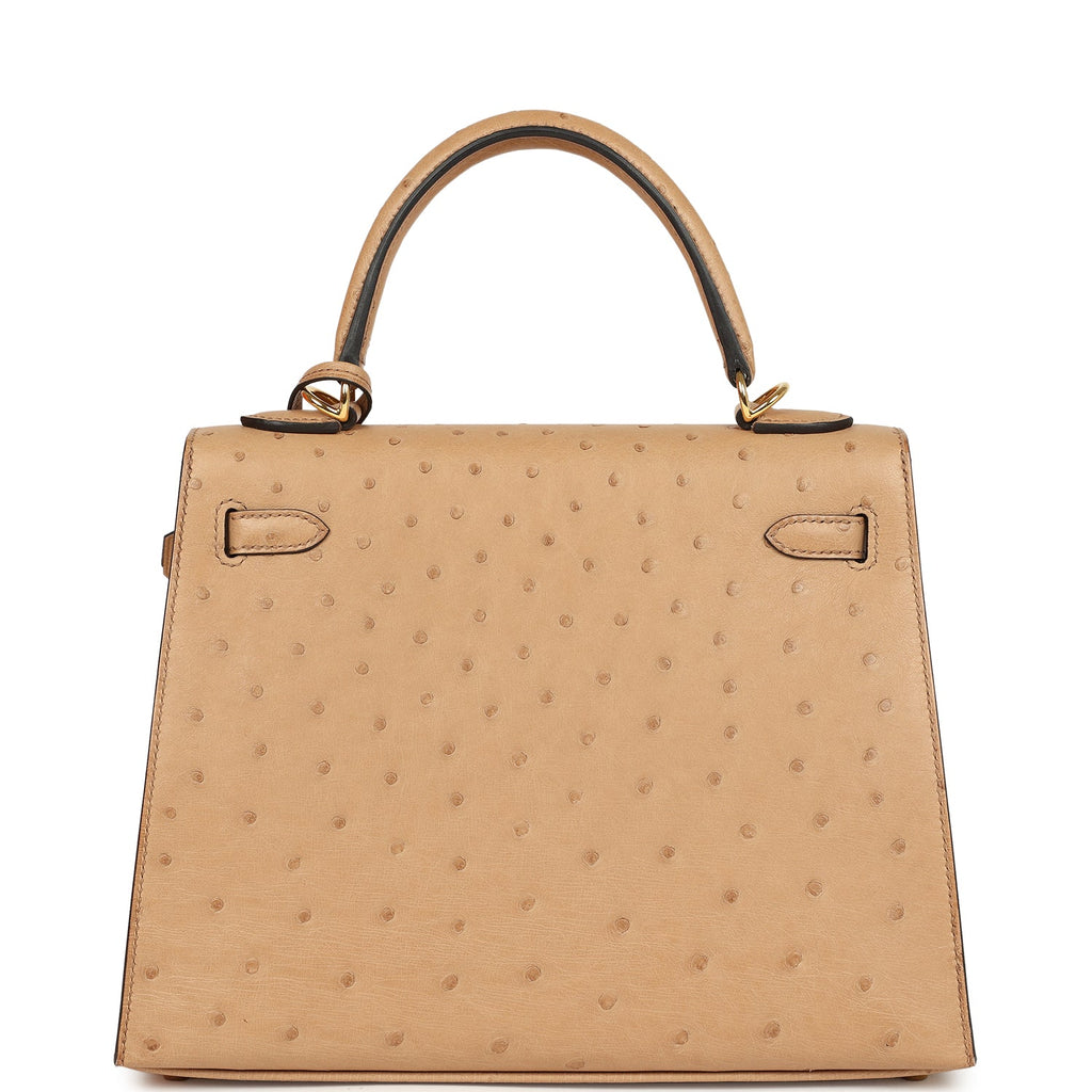 Pre-owned Hermes Kelly Sellier 25 Chai Ostrich Gold Hardware Shop for an authentic pre-owned Hermes Kelly Sellier 25 in Chai ostrich leather with gold hardware in excellent condition at Madison Avenue Couture.