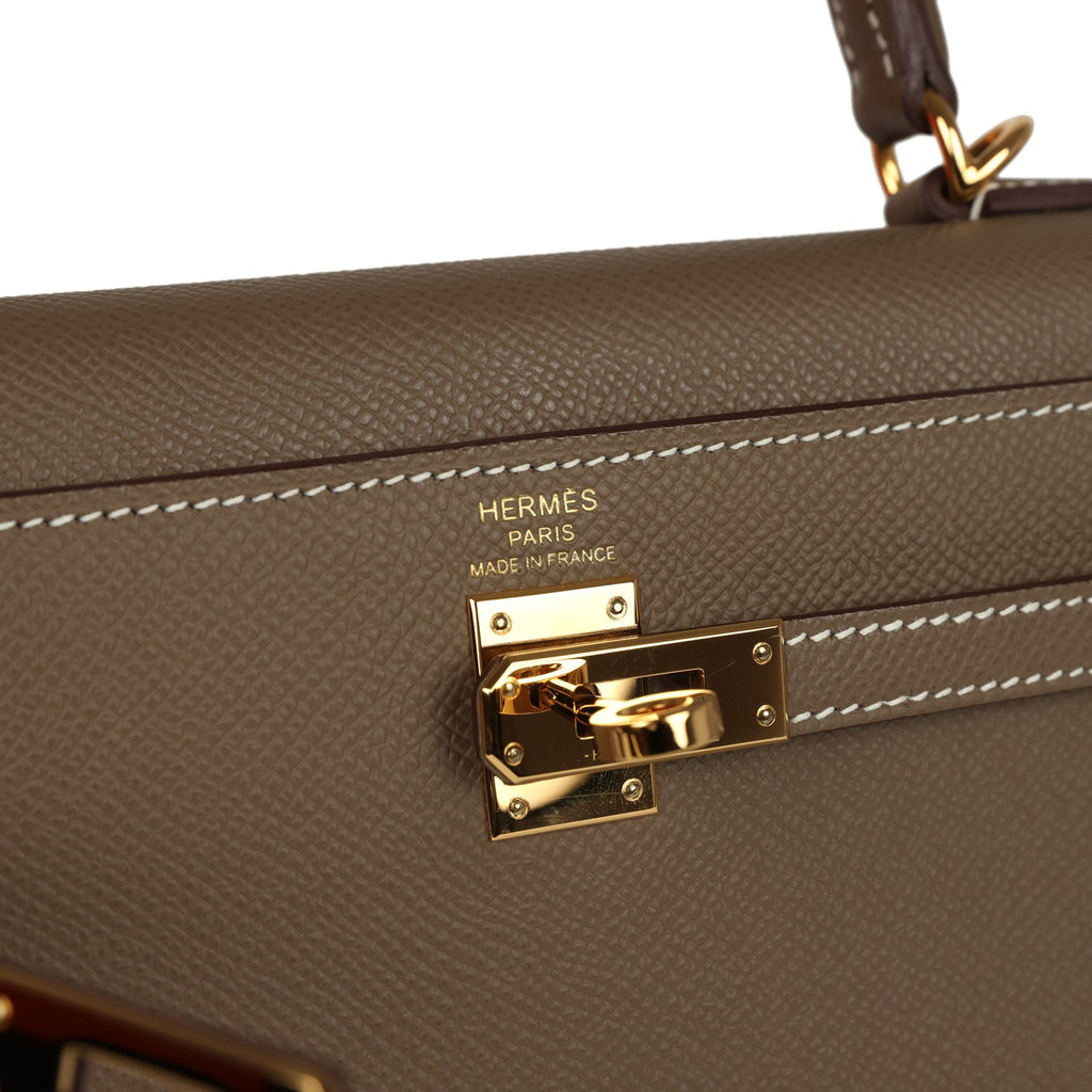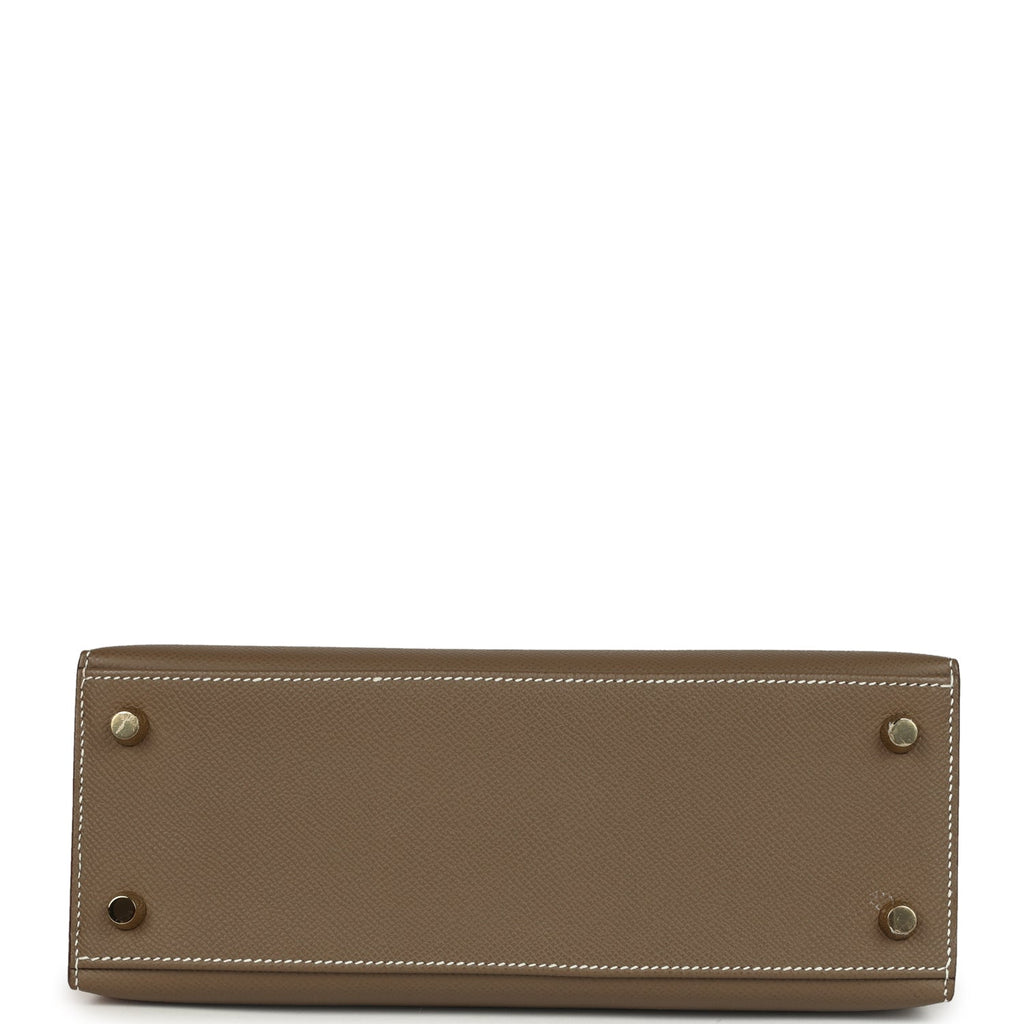 Pre-owned Hermes Kelly Sellier 25 Etoupe Epsom Gold Hardware Shop for an authentic pre-owned Hermes Kelly Sellier 25 in Etoupe epsom leather with gold hardware in mint condition at Madison Avenue Couture.