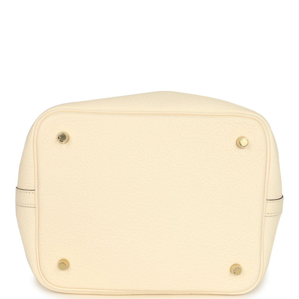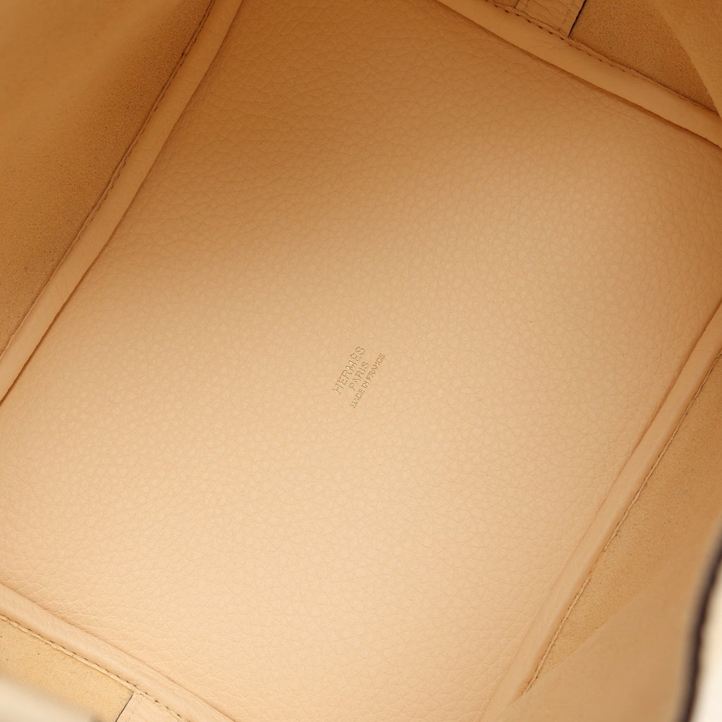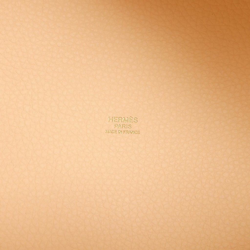 This Picotin is in Nata clemence leather with gold hardware and has tonal stitching with two top handles.The interior is lined with natural leather, no interior pockets and has a pull through closure secured by padlock.Collection: Z (2021)Origin: FranceCondition: Pre-owned; Excellent – This bag is relaxed in its shape structure. The right top handle is somewhat misshapen inwards. There is plastic on all the hardware except for one foot, resulting in light scratching to one of the feet. The exterior leather is clean with the exception of a small scuff to the back bottom left corner. The interior leather is clean with minimal signs of wear.Accompanied by: Hermes dustbag, lock, two keys, lock & keys dustbagMeasurements: 8.3″ width x 8.7″ height x 6.7″ depth; 5″ handles