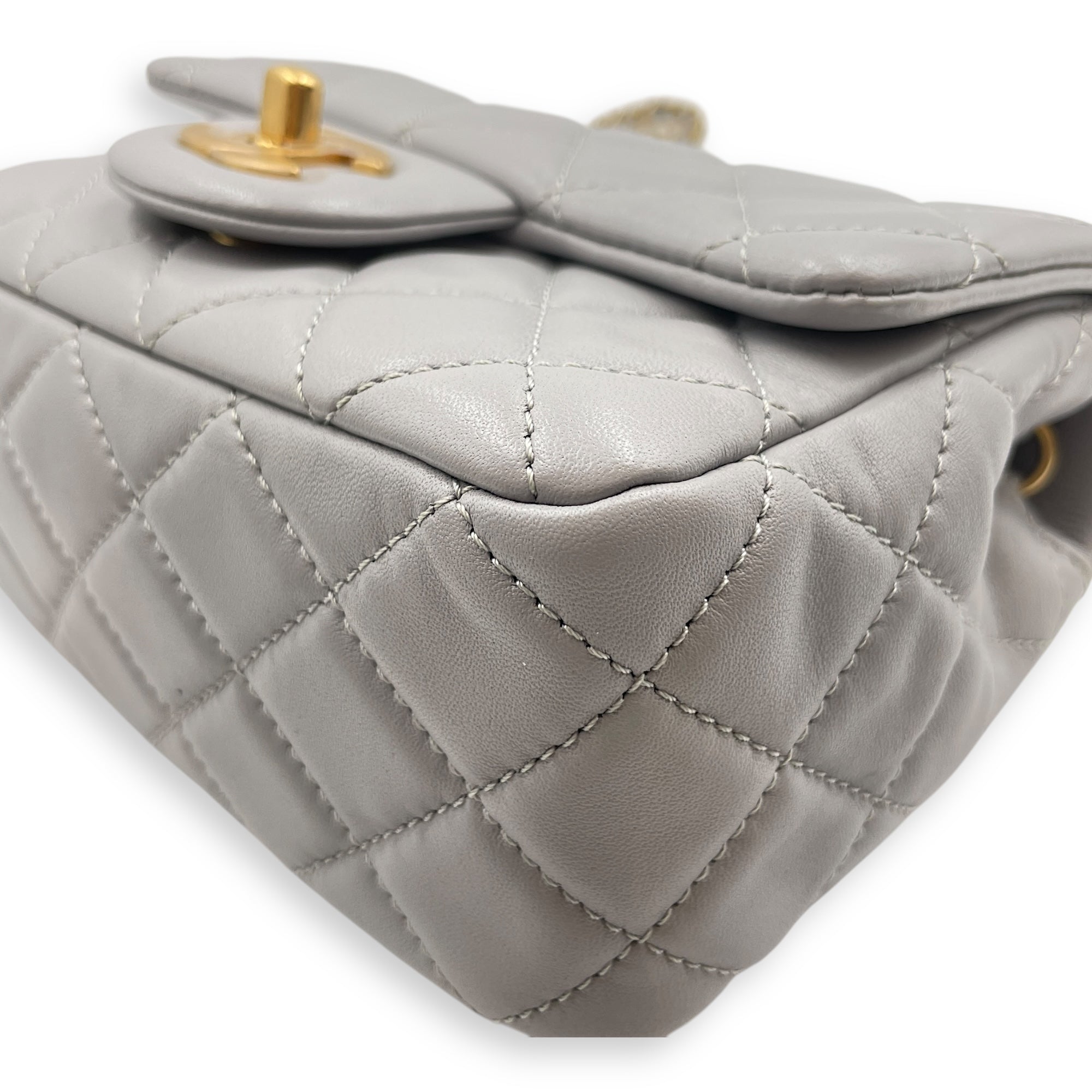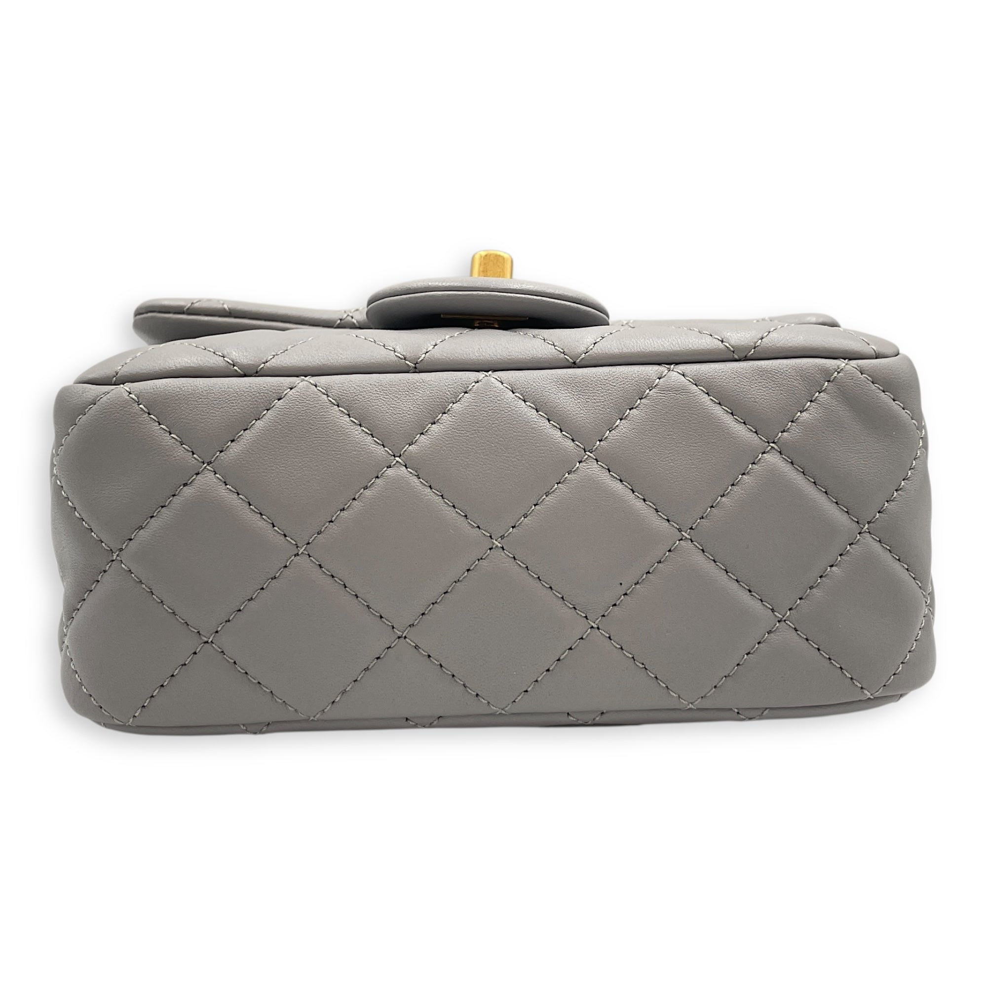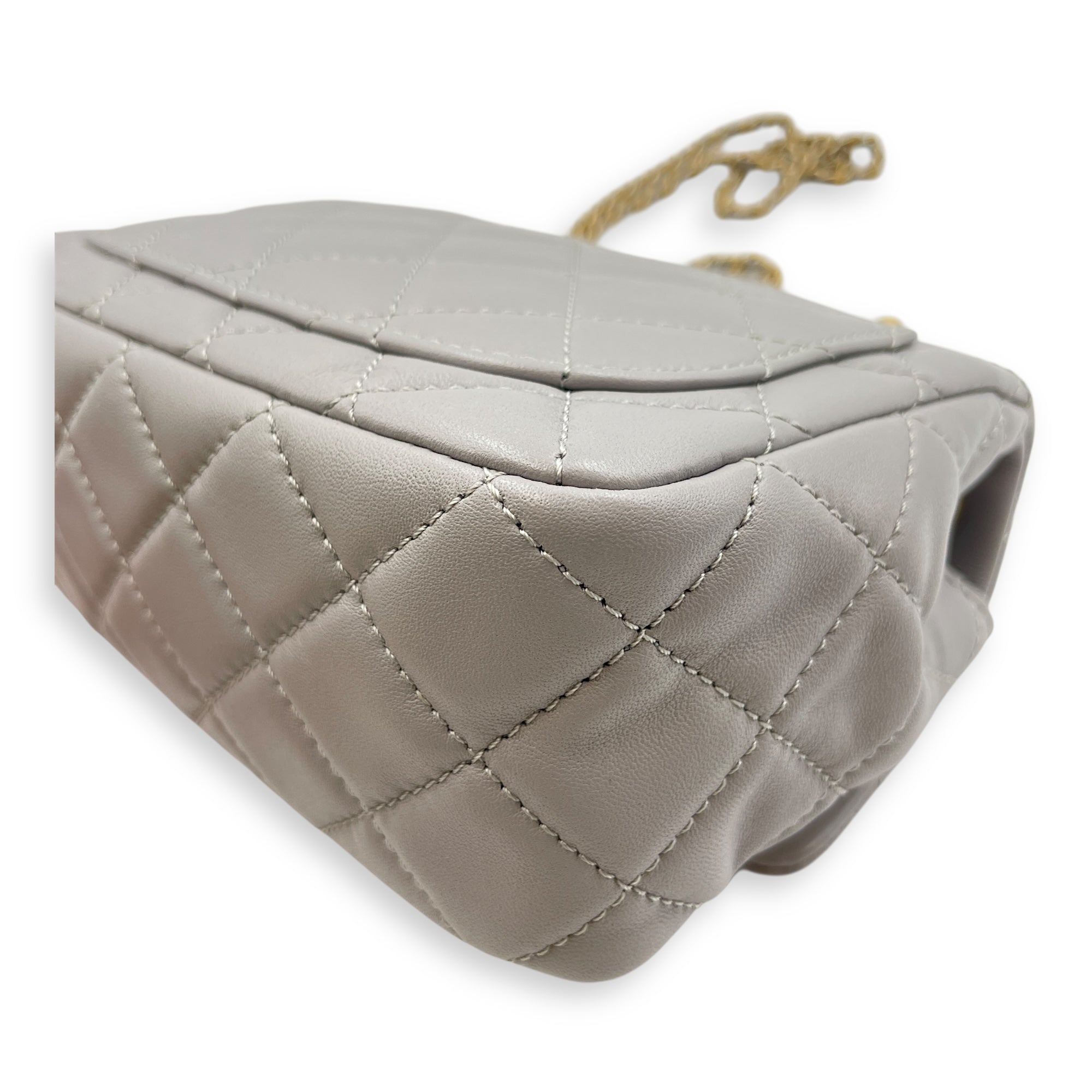 Quilted Pearl Crush Square Mini Grey Flap Bag with Adjustable Chain Strap in Lambskin, Brushed Gold hardware