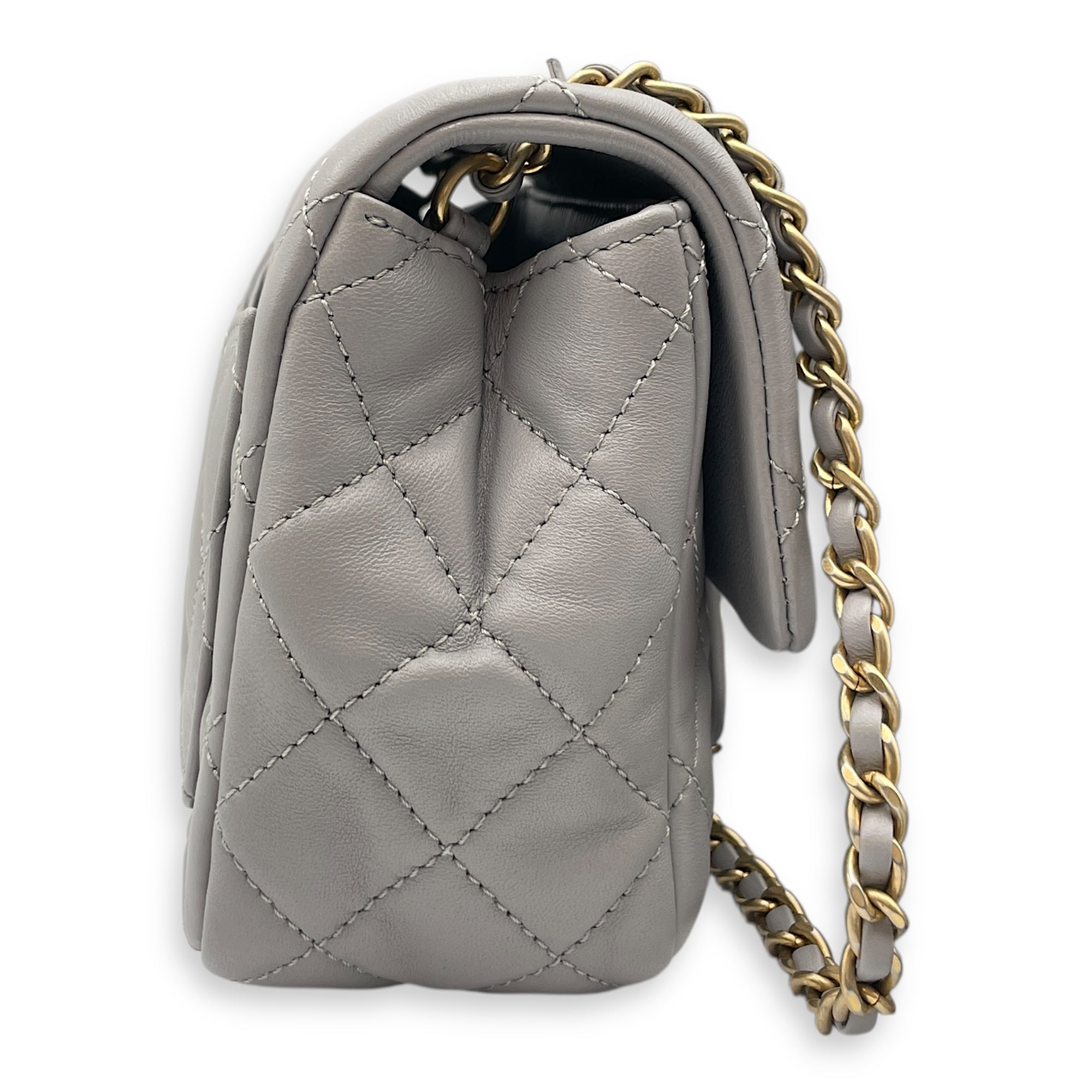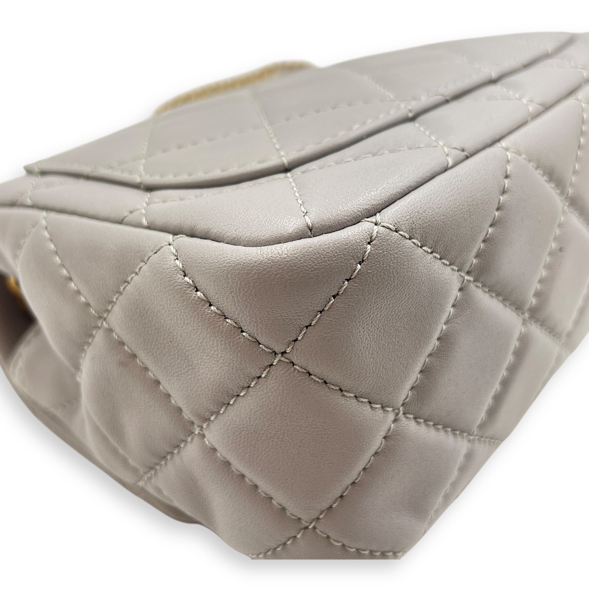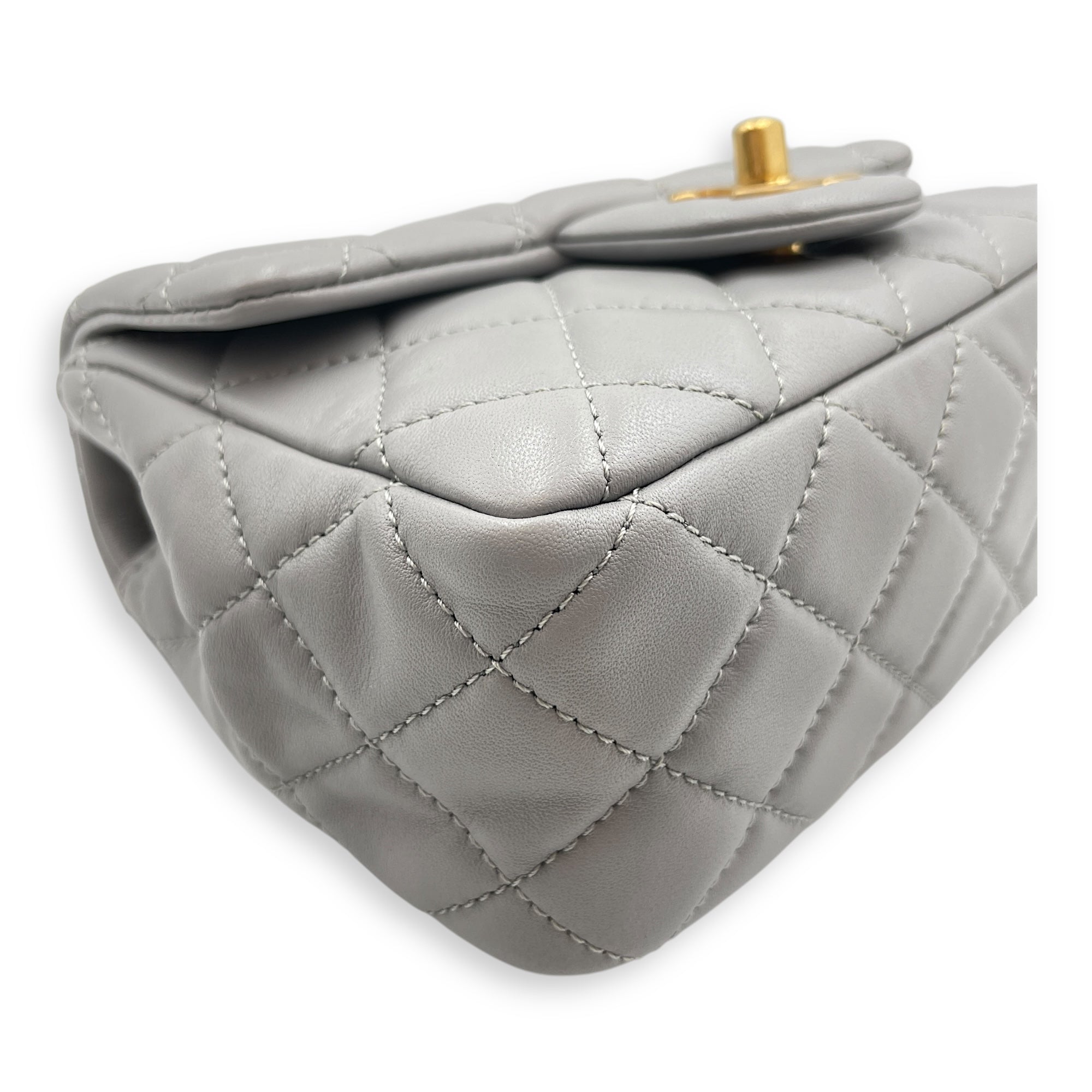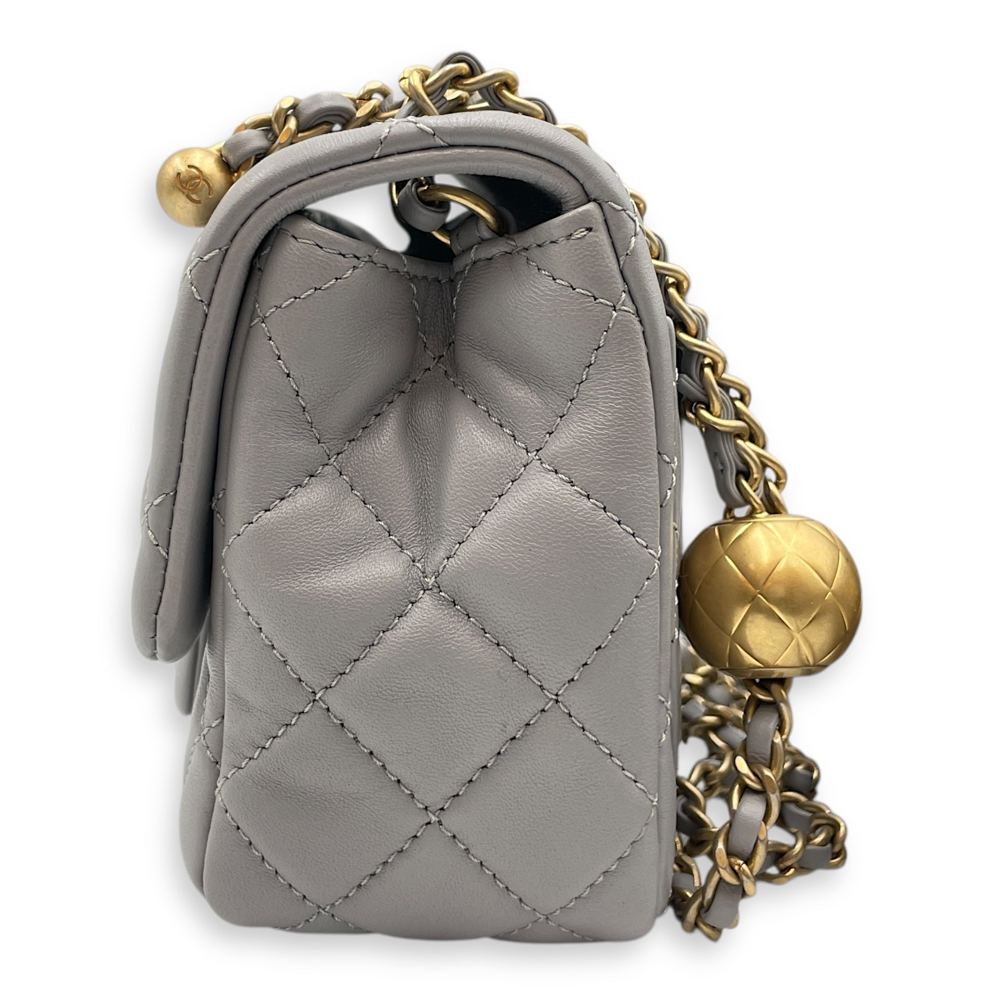 Quilted Pearl Crush Square Mini Grey Flap Bag with Adjustable Chain Strap in Lambskin, Brushed Gold hardware