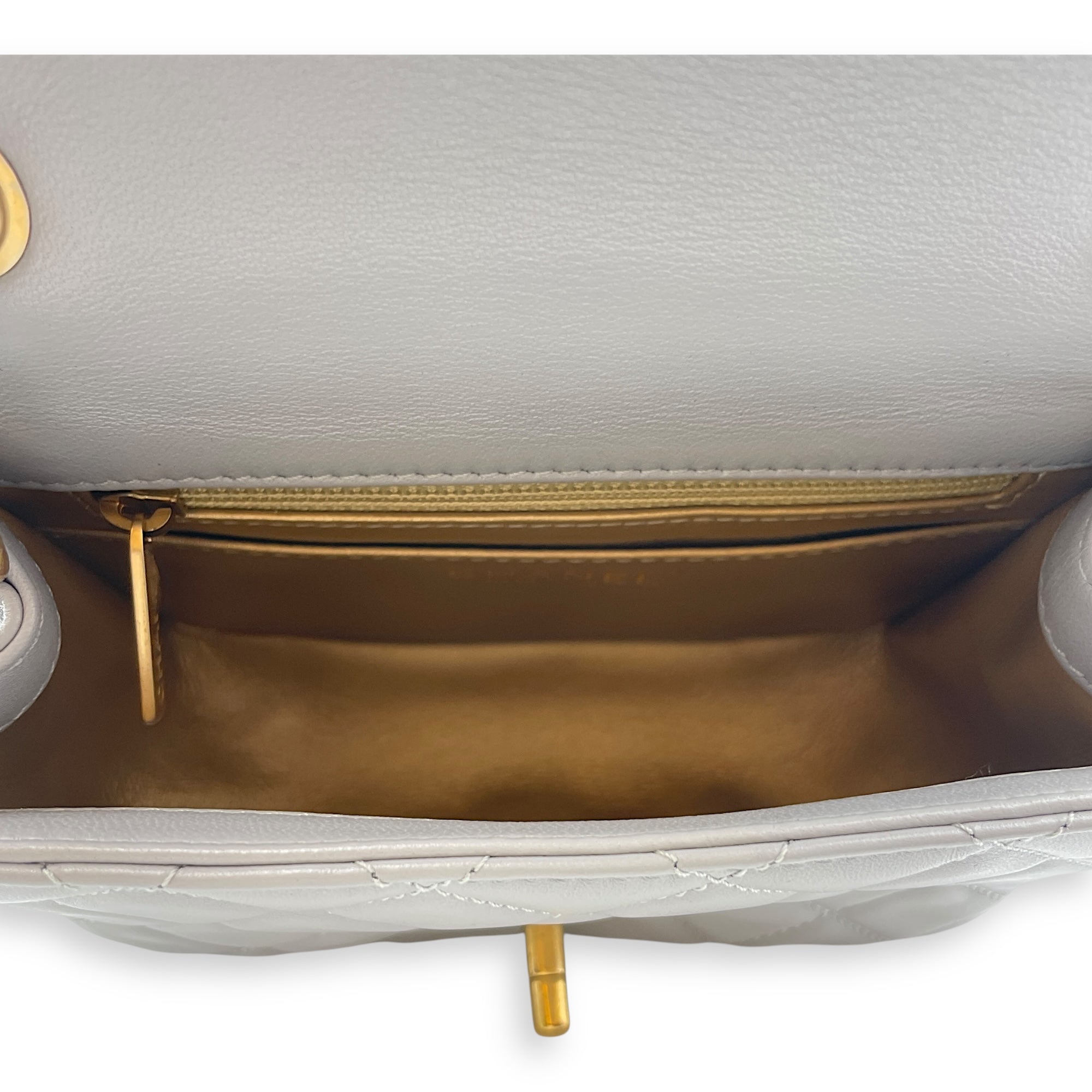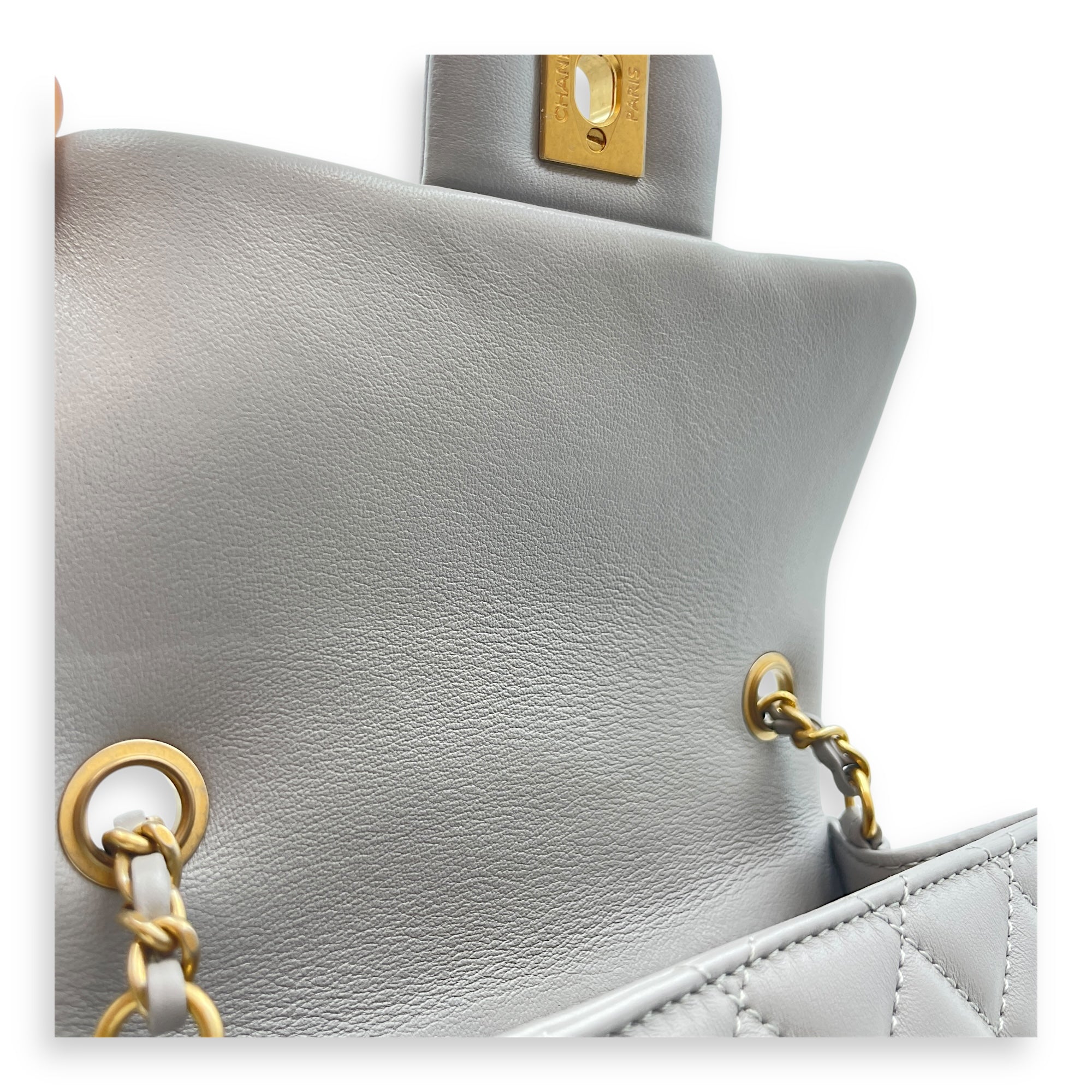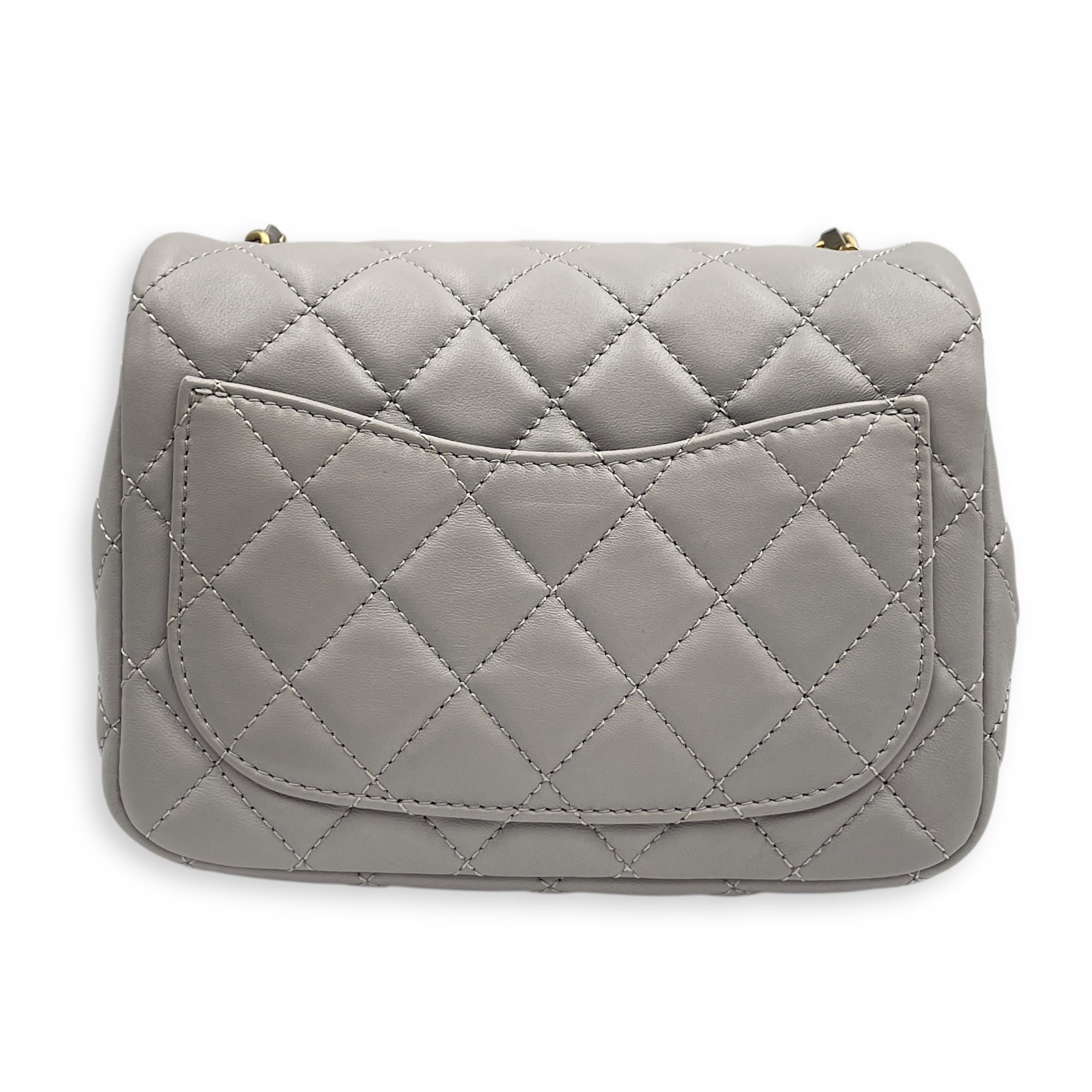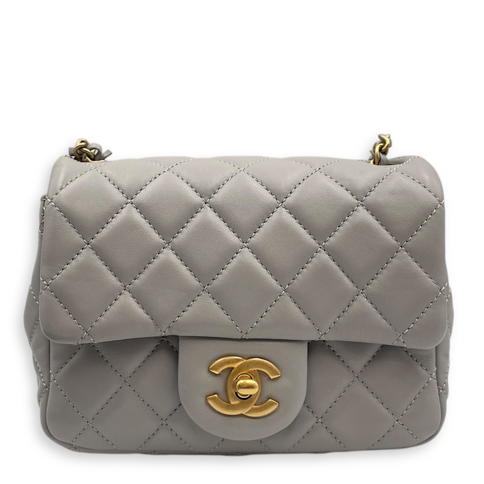 Be the first to review “Quilted Pearl Crush Square Mini Grey Flap Bag with Adjustable Chain Strap in Lambskin, Brushed Gold hardware”
