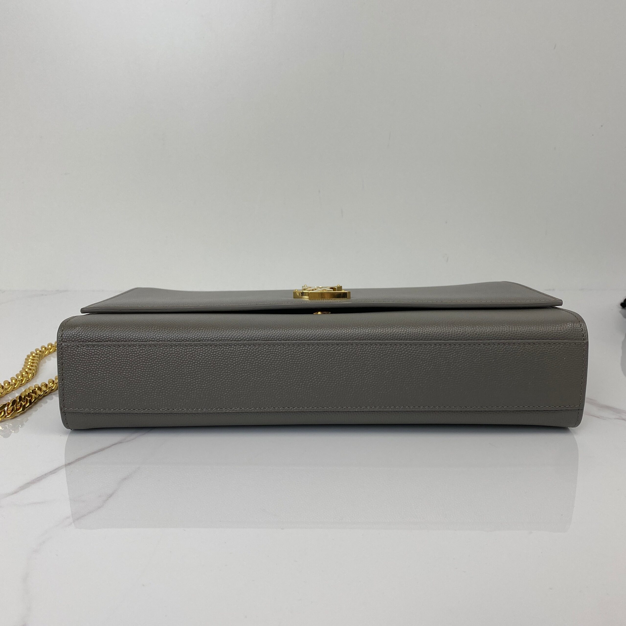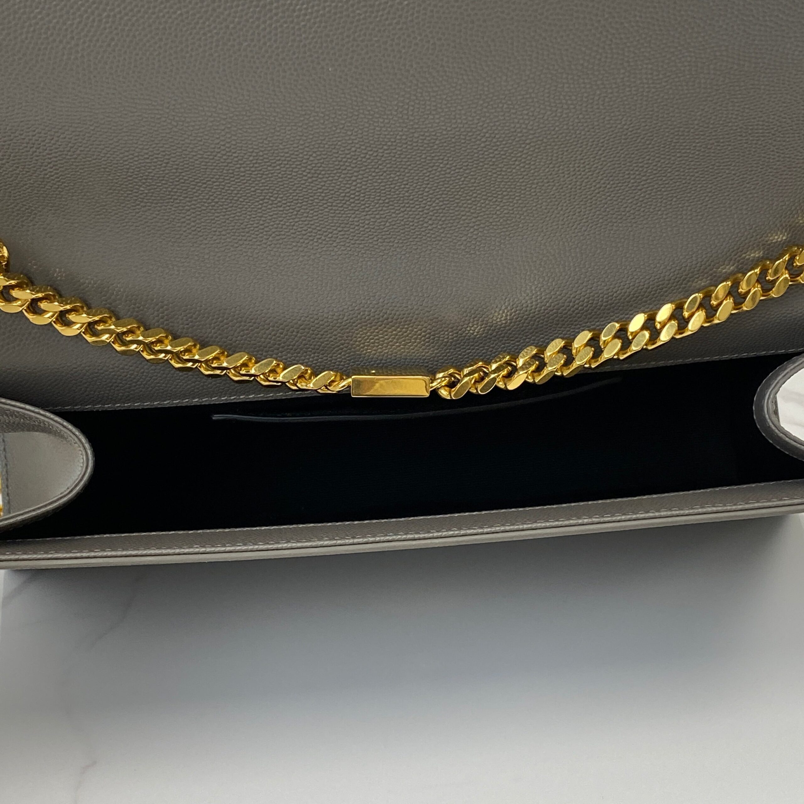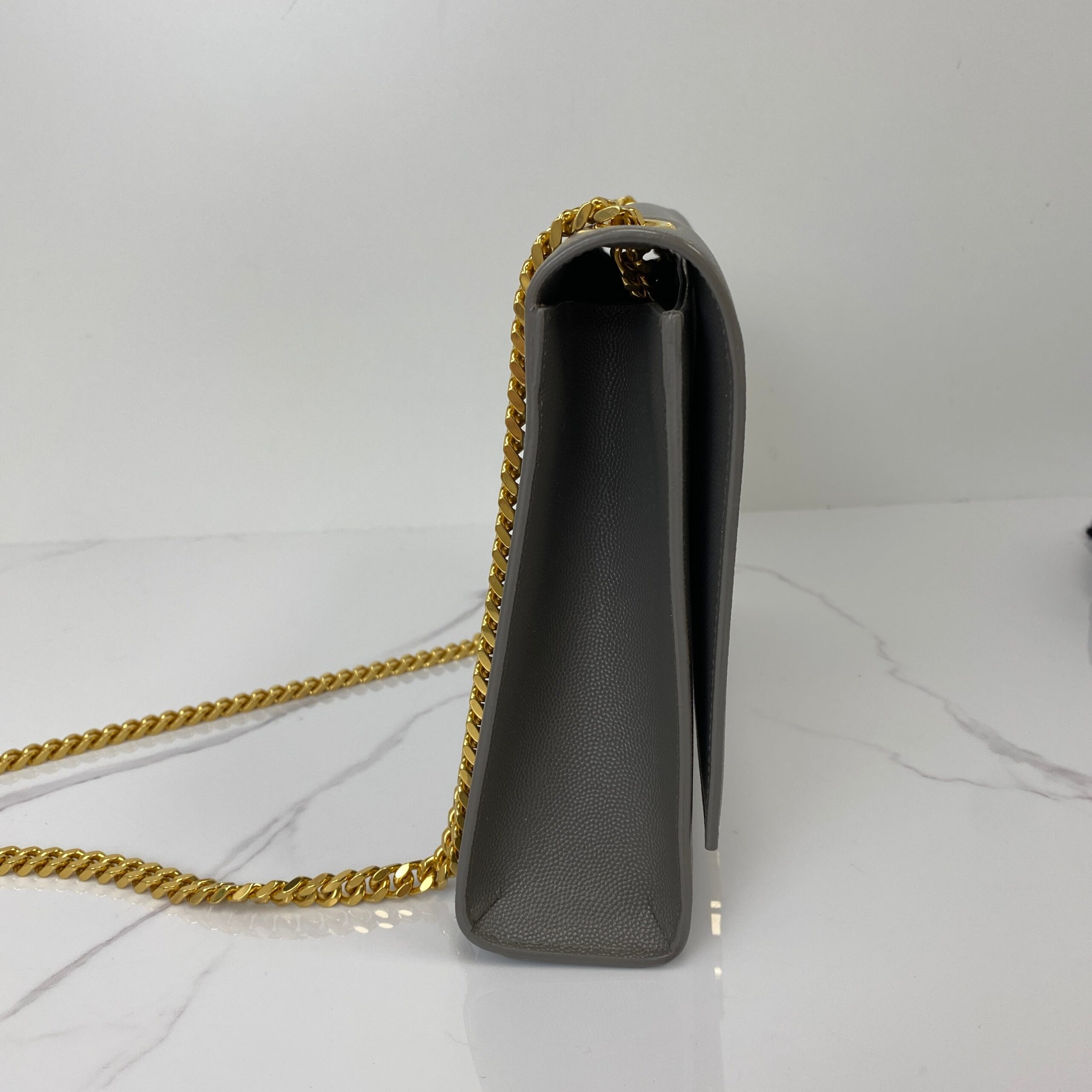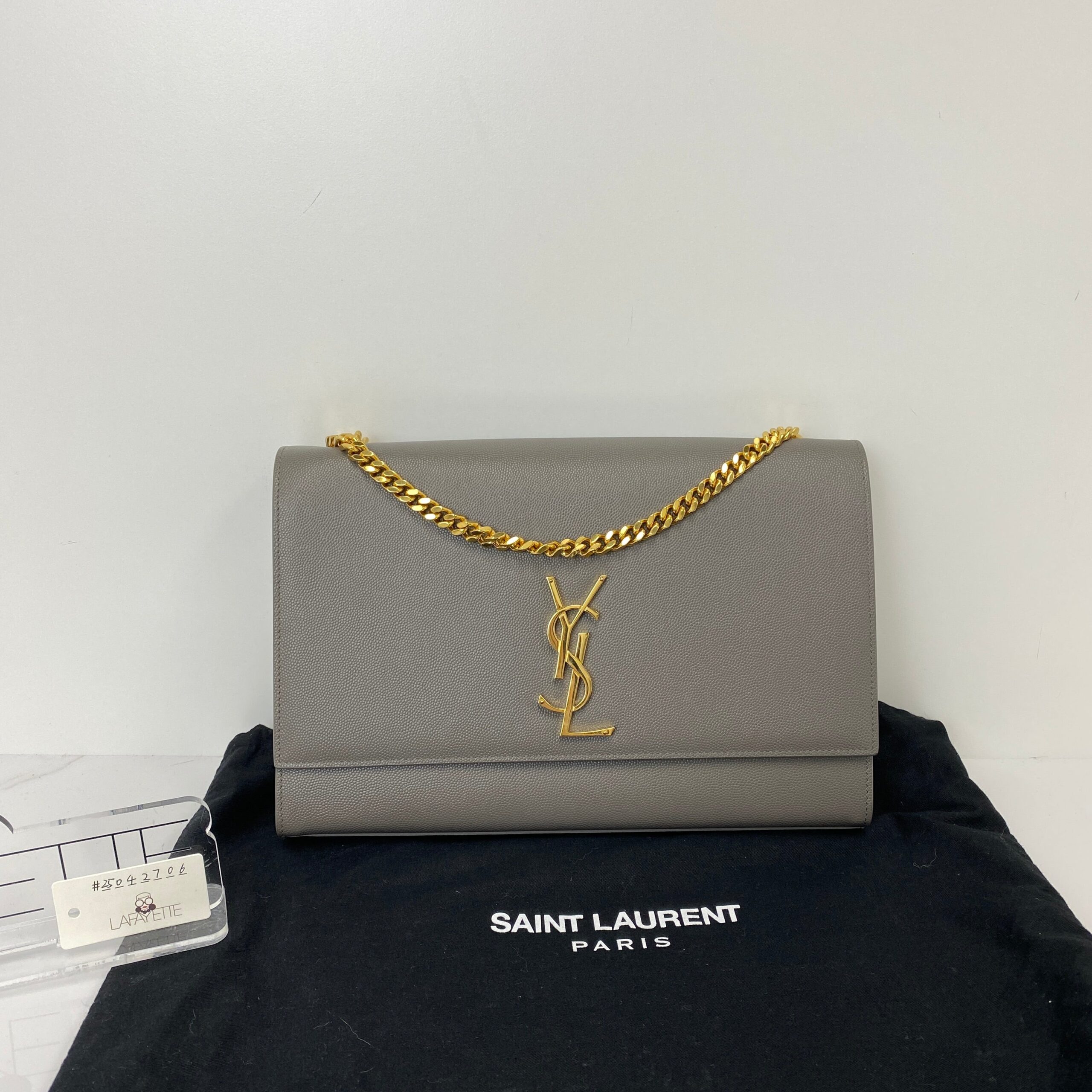 Refined, iconic, unforgettable—the Saint Laurent Kate in grey grainy calfskin blends sharp design with quiet strength. A piece that carries more than your essentials; it carries confidence.