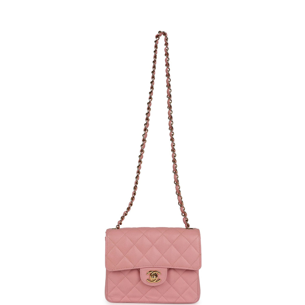 Vintage Chanel Mini Square Flap Pink Caviar Gold Hardware Shop for an authentic vintage Chanel Mini Classic Square Flap in Pink Lambskin with gold hardware in excellent condition at Madison Avenue Couture.